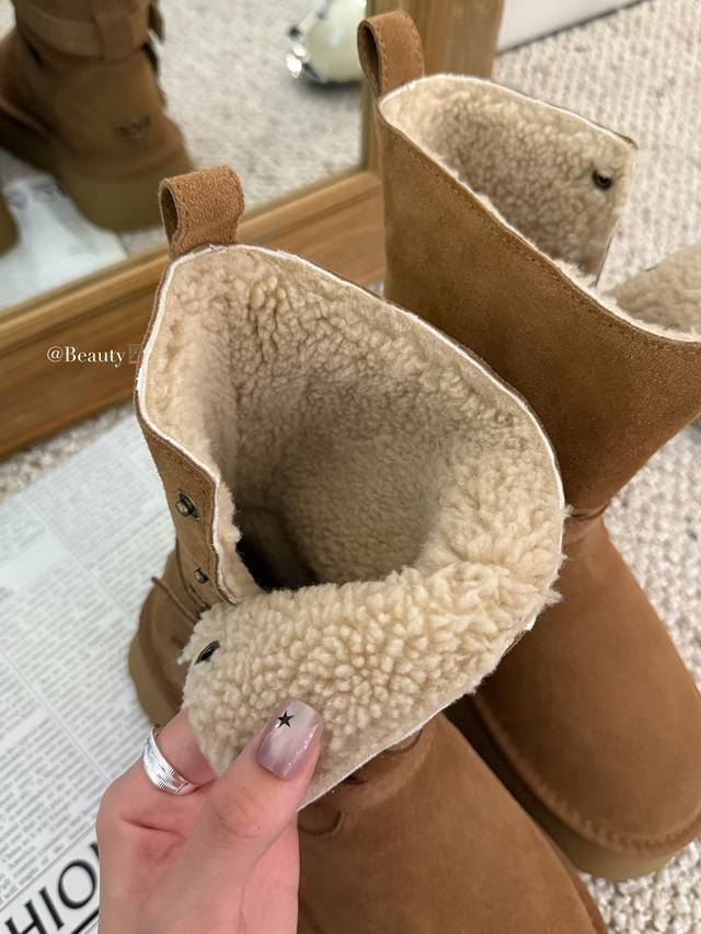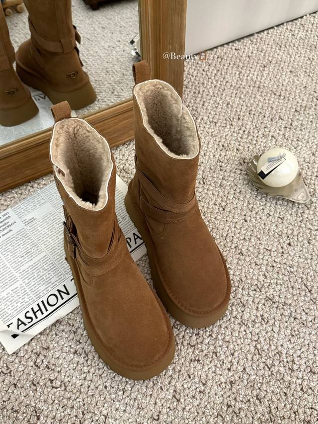 暖扣机车靴救命!这双Ugg骑士雪地靴也太会了吧!! 牛绒面革+内里羊毛一整个把冬日温暖拿捏住 皮带设计飒爽感拉满,厚底还悄悄显高 穿上它踩雪逛街都像踩在云朵上