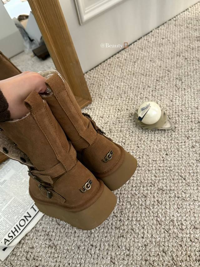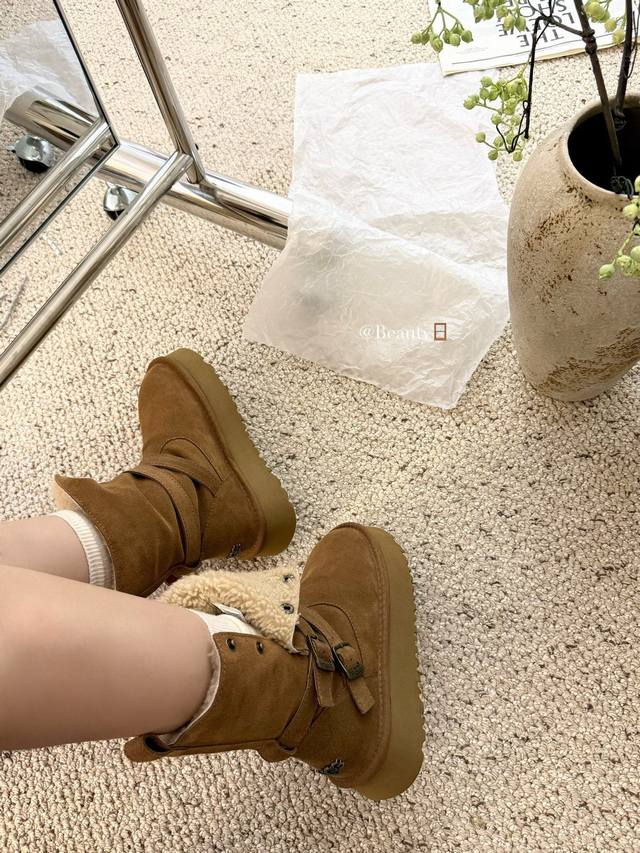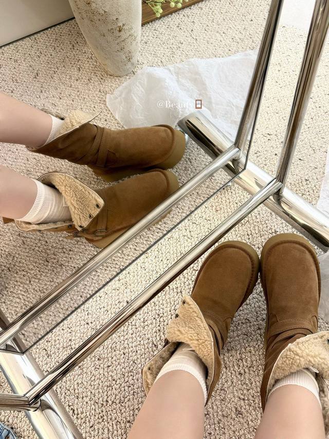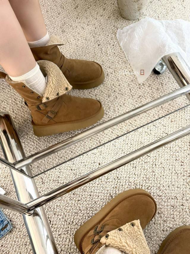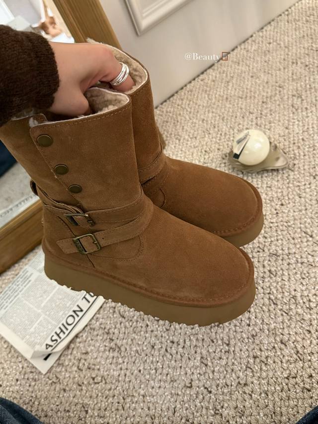 / 暖扣机车靴救命!这双Ugg骑士雪地靴也太会了吧!! 牛绒面革+内里羊毛一整个把冬日温暖拿捏住 皮带设计飒爽感拉满,厚底还悄悄显高 穿上它踩雪逛街都像踩在云朵上