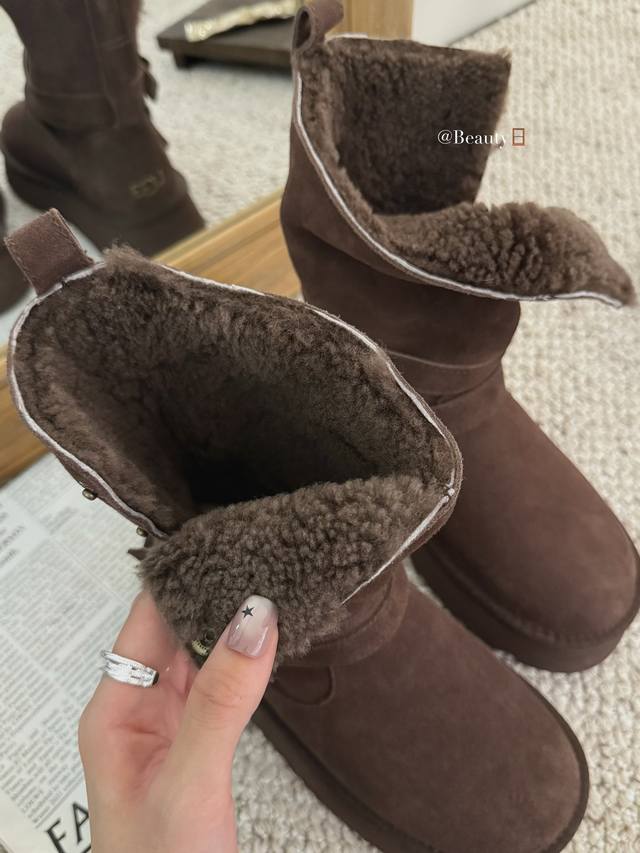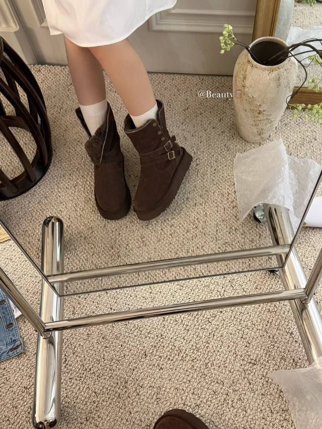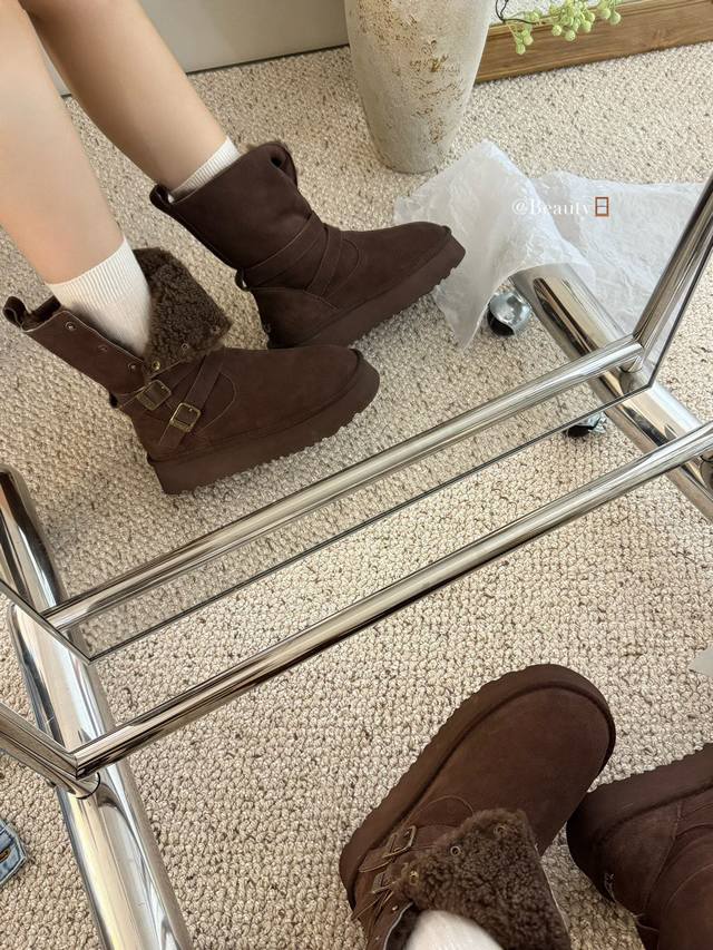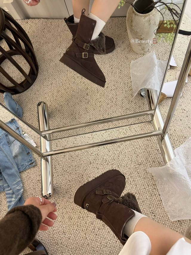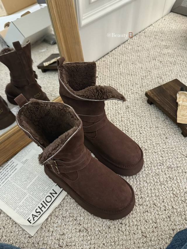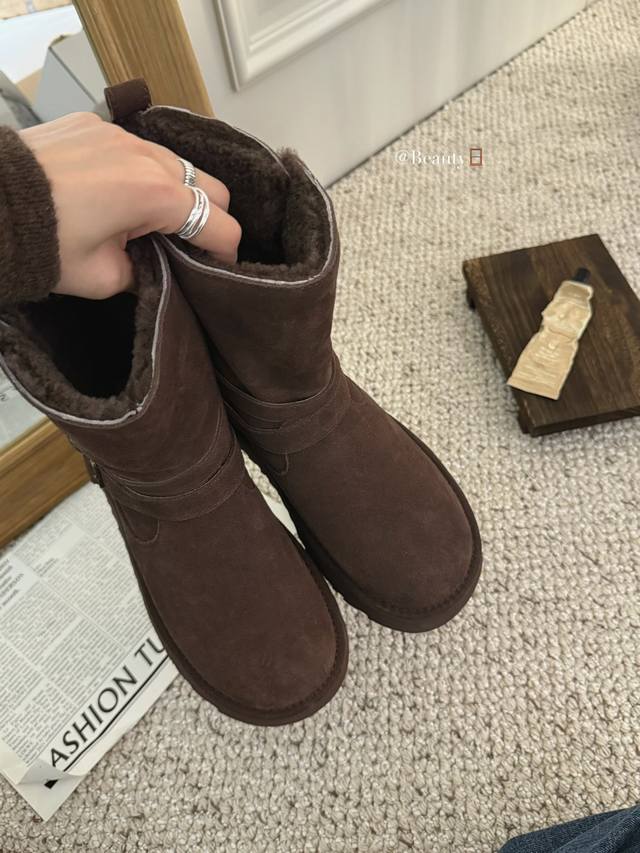/ 暖扣机车靴救命!这双Ugg骑士雪地靴也太会了吧!! 牛绒面革+内里羊毛一整个把冬日温暖拿捏住 皮带设计飒爽感拉满,厚底还悄悄显高 穿上它踩雪逛街都像踩在云朵上