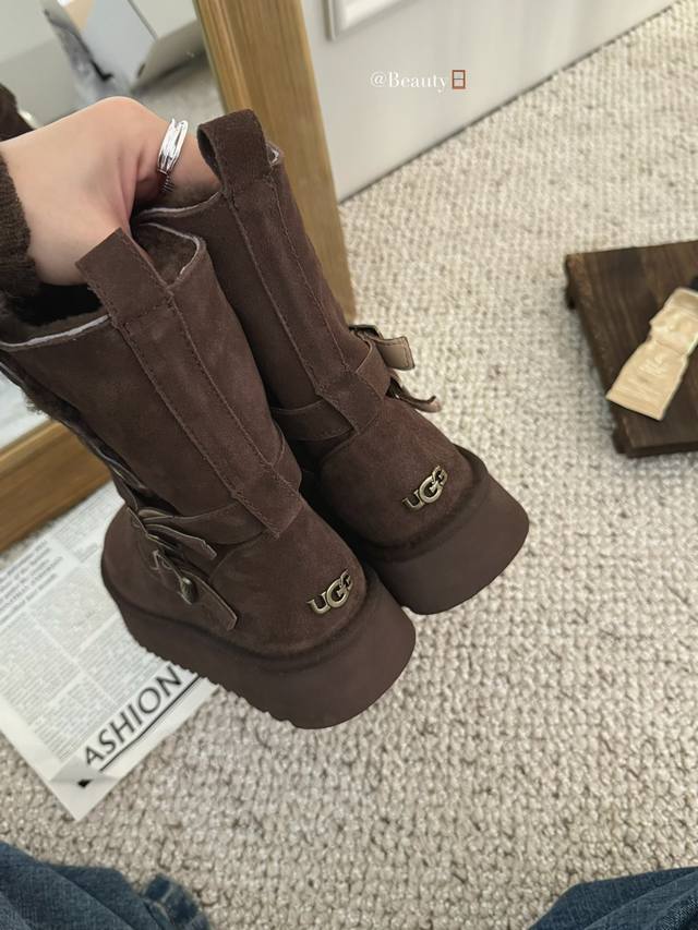 暖扣机车靴救命!这双Ugg骑士雪地靴也太会了吧!! 牛绒面革+内里羊毛一整个把冬日温暖拿捏住 皮带设计飒爽感拉满,厚底还悄悄显高 穿上它踩雪逛街都像踩在云朵上