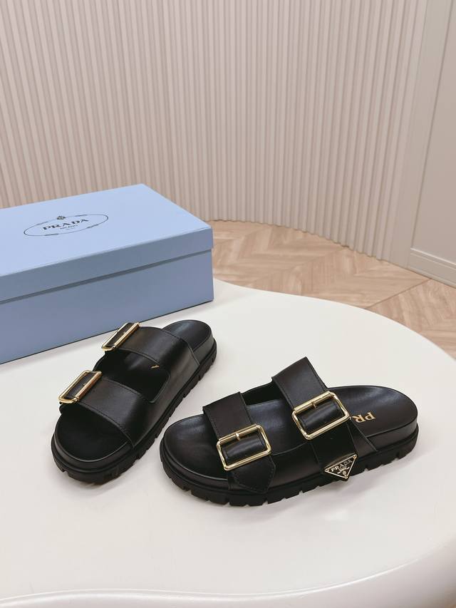 / 最新系列!Prada 普拉达 春夏新款凉鞋 双排扣拖鞋 最新走秀系列 经典升级 舒适度与时髦度并存 每个颜色搭配都好看,设计搭配不同风格需求 鞋面:原版定制牛猄