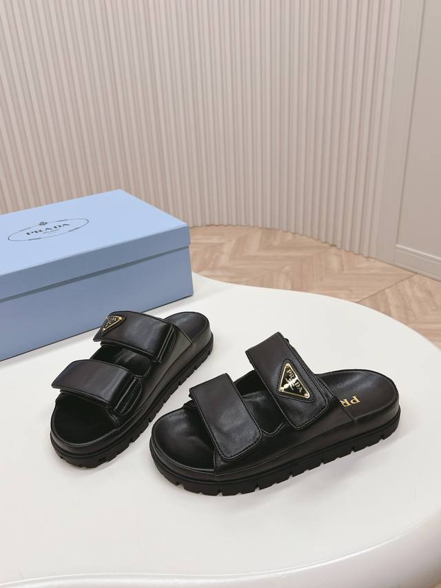 最新系列!Prada 普拉达 春夏新款凉鞋 魔术贴拖鞋 最新走秀系列 经典升级 舒适度与时髦度并存 每个颜色搭配都好看,设计搭配不同风格需求 鞋面:原版定制牛皮
