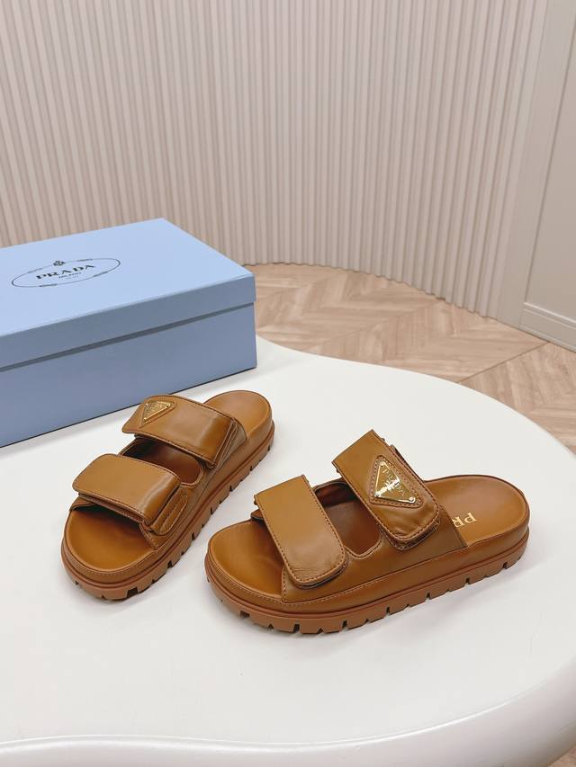 / 最新系列!Prada 普拉达 春夏新款凉鞋 魔术贴拖鞋 最新走秀系列 经典升级 舒适度与时髦度并存 每个颜色搭配都好看,设计搭配不同风格需求 鞋面:原版定制牛皮