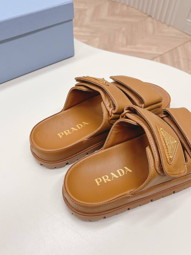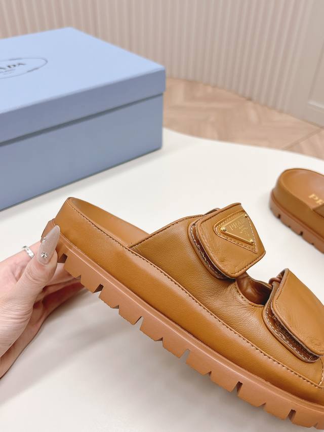最新系列!Prada 普拉达 春夏新款凉鞋 魔术贴拖鞋 最新走秀系列 经典升级 舒适度与时髦度并存 每个颜色搭配都好看,设计搭配不同风格需求 鞋面:原版定制牛皮