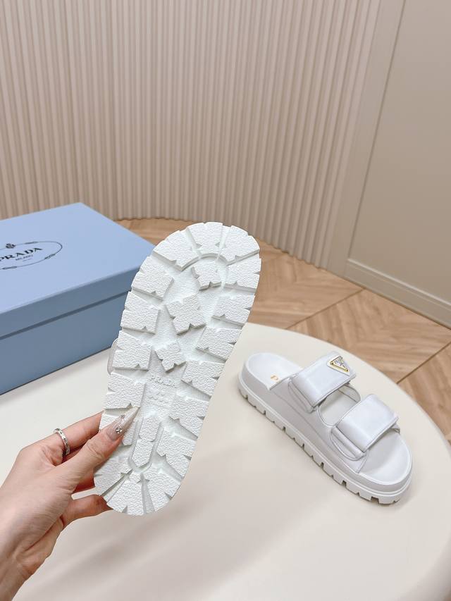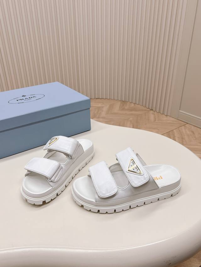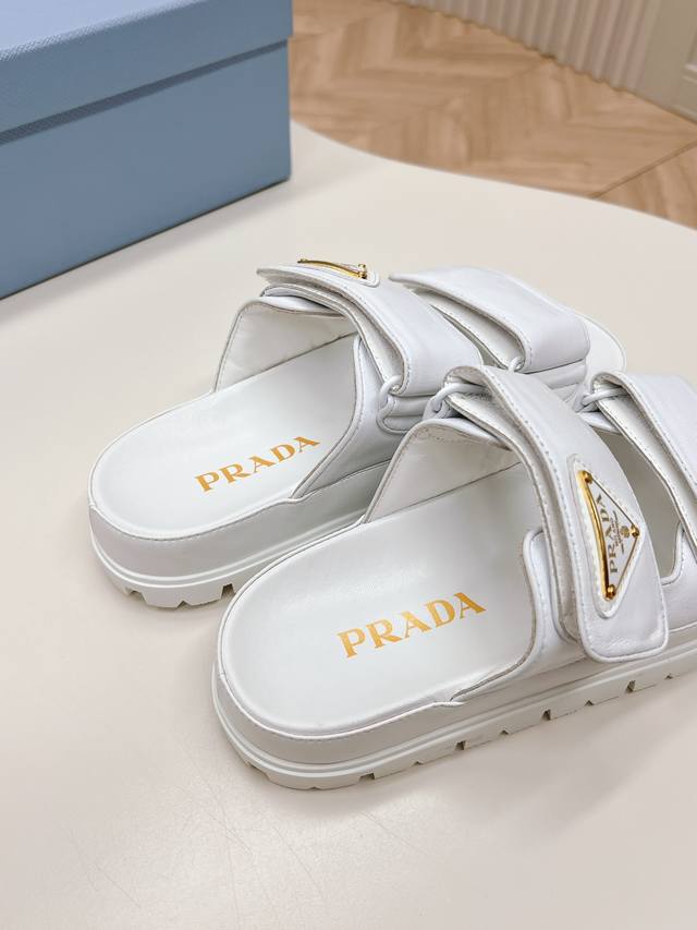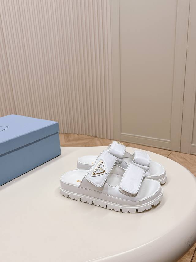 / 最新系列!Prada 普拉达 春夏新款凉鞋 魔术贴拖鞋 最新走秀系列 经典升级 舒适度与时髦度并存 每个颜色搭配都好看,设计搭配不同风格需求 鞋面:原版定制牛皮