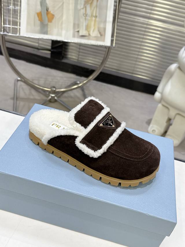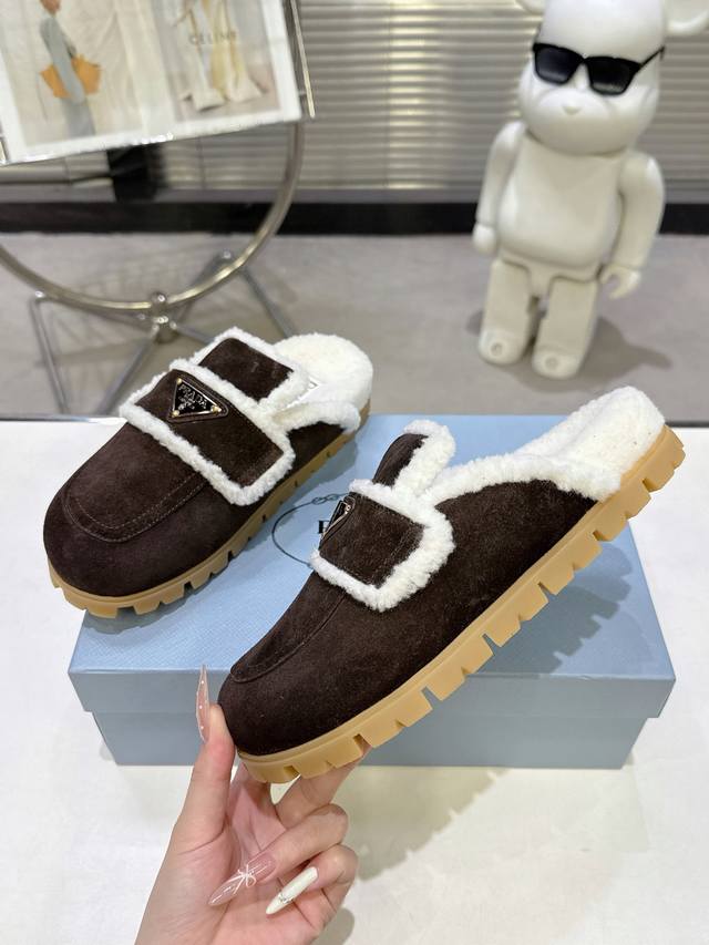 / 最新系列!Prada 普拉达2025秋冬季新款毛拖鞋 三角扣面包包头半拖鞋 最新走秀系列 经典升级 舒适度与时髦度并存 每个颜色搭配都好看,设计搭配不同风格需求