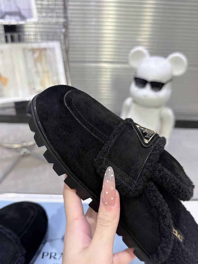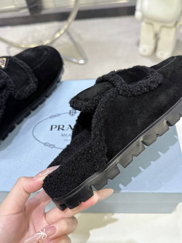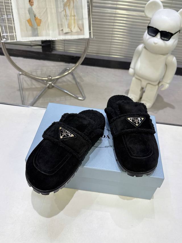 / 最新系列!Prada 普拉达2025秋冬季新款毛拖鞋 三角扣面包包头半拖鞋 最新走秀系列 经典升级 舒适度与时髦度并存 每个颜色搭配都好看,设计搭配不同风格需求