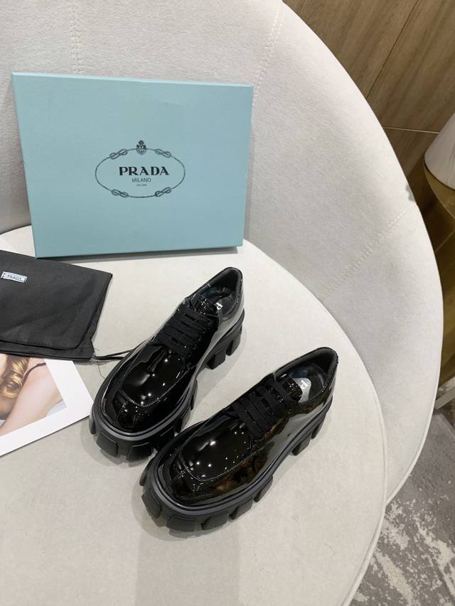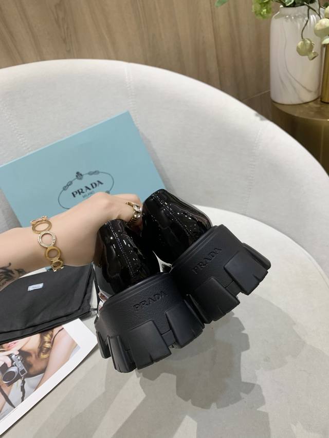 最高版本 普拉达 秋冬新款黑色开边朱漆皮厚底休闲小皮鞋,刘雯众多网红上脚,Prad这款松糕厚底鞋今年非常爆,穿上 增高 休闲两不失误,清爽的表现足以表达对鞋子的