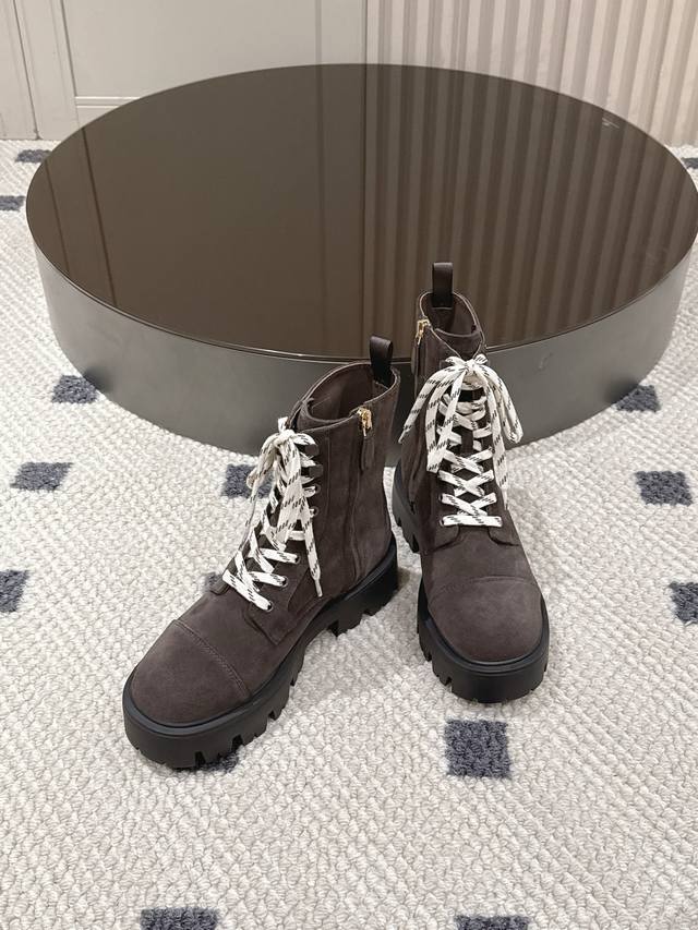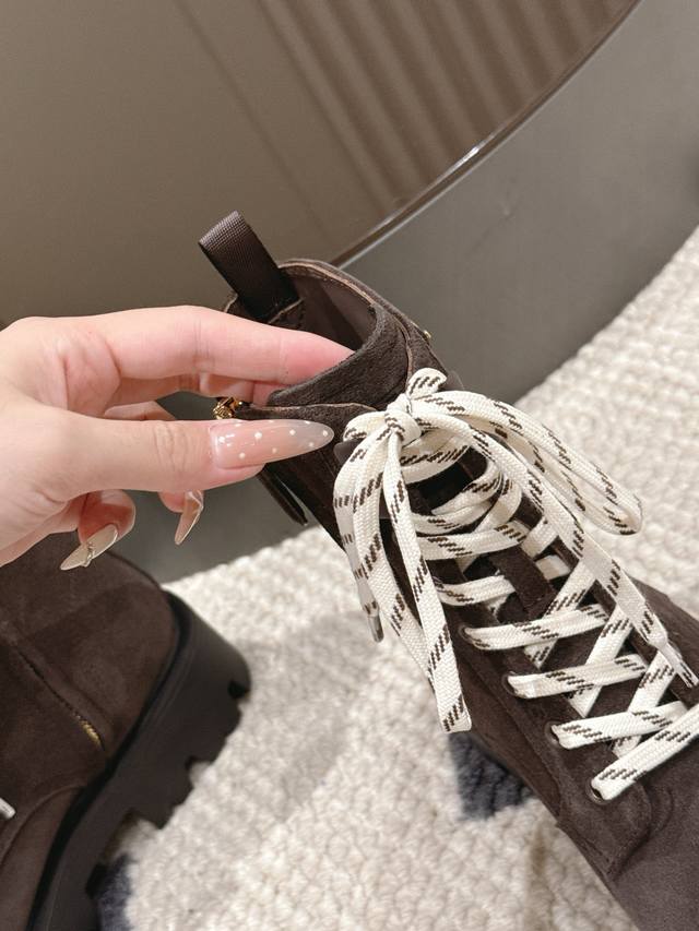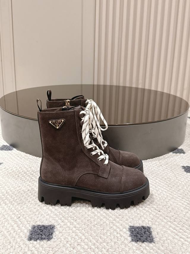 牛反绒 。牛皮面 。码数35-40 41定做 Prada 2025 新款系带厚底靴惊艳亮相,直接美出新高度! 5Cm的厚底设计,不仅悄咪咪帮你拉长腿部线条,营造出大长腿既视感,走路时还超稳,轻松提升气场。鞋面的系带元素增添了随性与不羁,可根据喜好自由调节松紧,打造独特风格 。 经典的黑色款,酷帅百搭,无论是搭配西装裤展现干练职场风,还是配上短裙打造甜酷少女感,都毫无压力;质感满满的棕色、温柔的卡其色,也是吸睛又时髦,适配各种秋冬氛围感穿搭。 再加上标志性的Prada三角标点缀,精致感拉满,细节之处尽显奢华