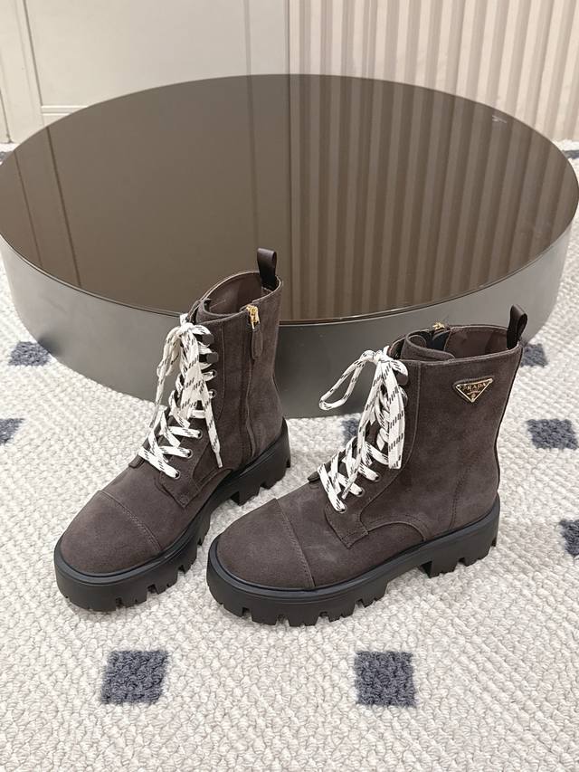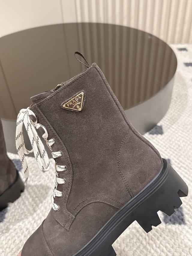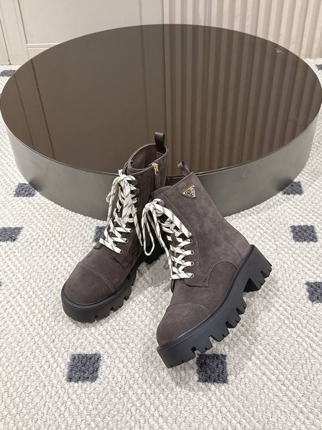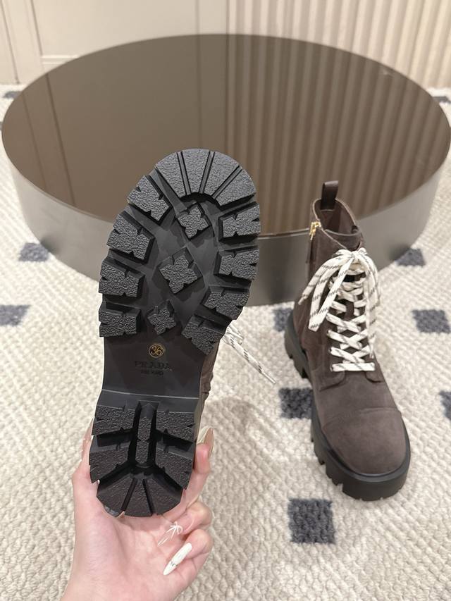 牛反绒 。牛皮面 。码数35-40 41定做 Prada 2025 新款系带厚底靴惊艳亮相,直接美出新高度! 5Cm的厚底设计,不仅悄咪咪帮你拉长腿部线条,营造