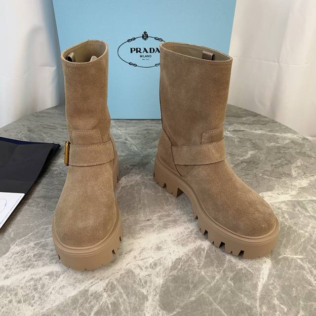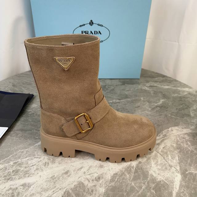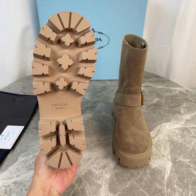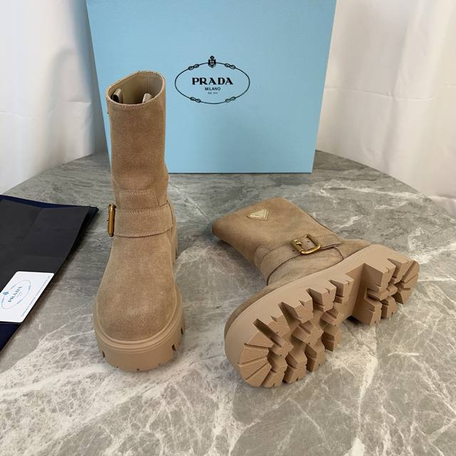 皮 ,绒390 P家最新款 面:进口全粒面牛皮、高丝光牛反绒 里:进口小牛皮 垫:进口小牛皮 底:原版工艺大底 厚6Cm 标志性三角标,原版包装 Size:35-42 41.42定制