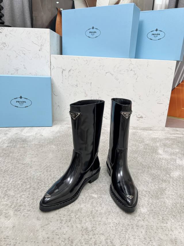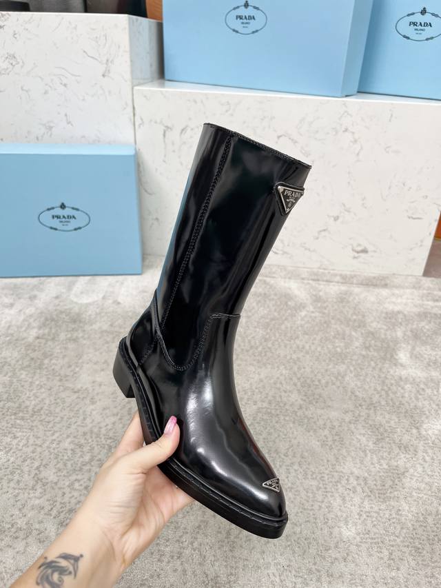 码数:35-40 41定做 顶奢版本“Prada 普拉达”经典三角标尖头靴 Prada能在重要场合用得上了,清新风带点小贵气的感觉,上脚非常完美显腿瘦气质这块刚