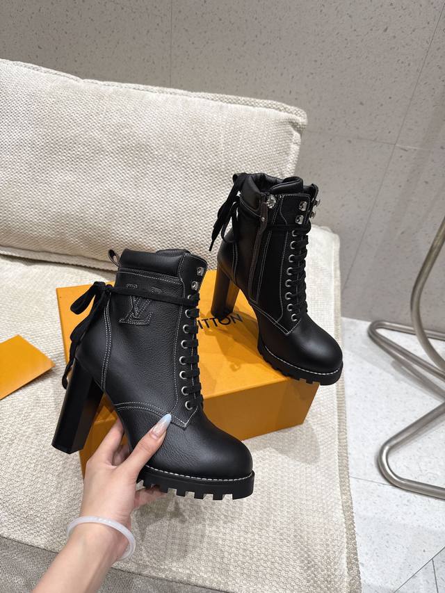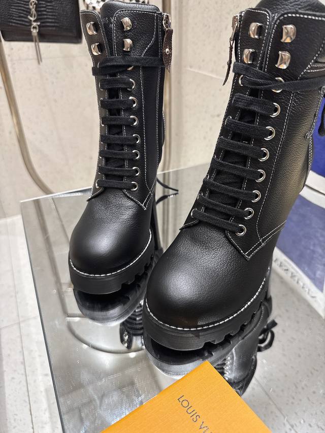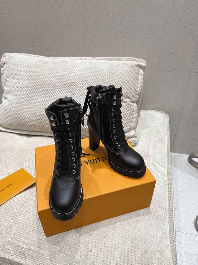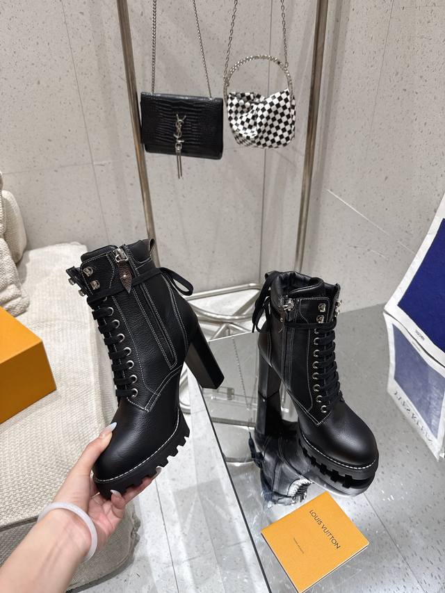 系带及踝靴 作为路易威登颇为瞩目的设计之一,本款 Star Trail 及踝靴以 Monogram 牛皮构筑经典造型。牛皮革饰边为军旅气质注入时尚格调,搭配金属链条和粗粝厚底。 鞋面:进口牛皮 内里: 羊皮内里 大底:原版大底 跟高:3Cm 鞋码: 35-41 40.41定做不退换