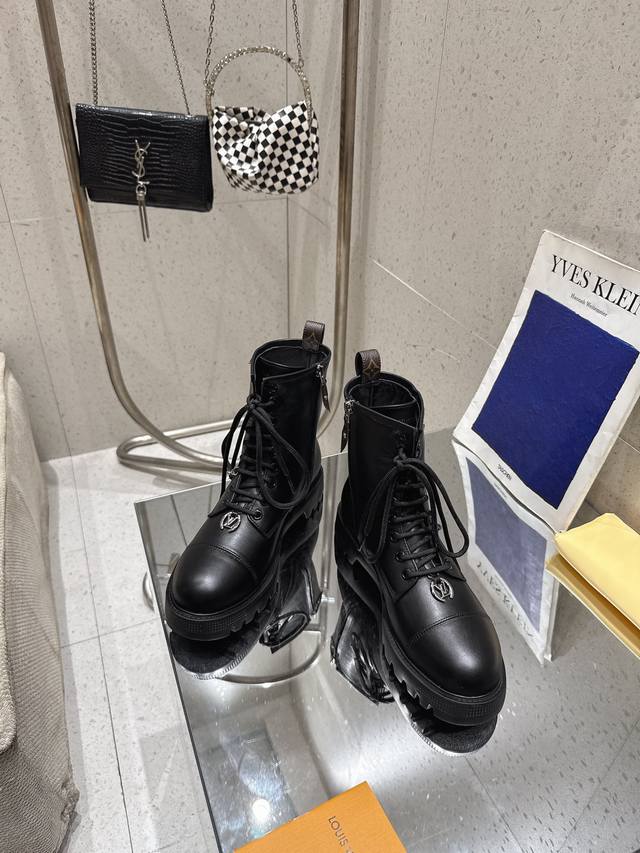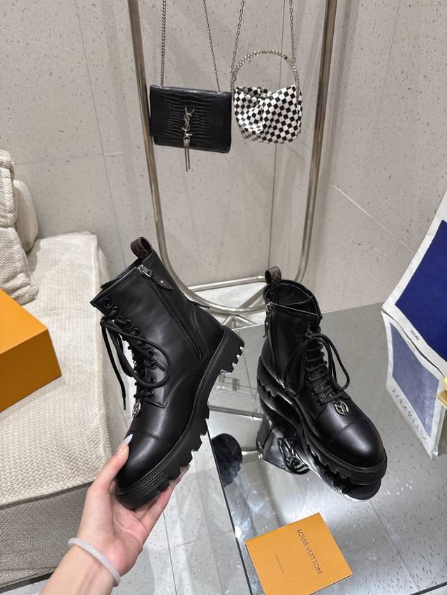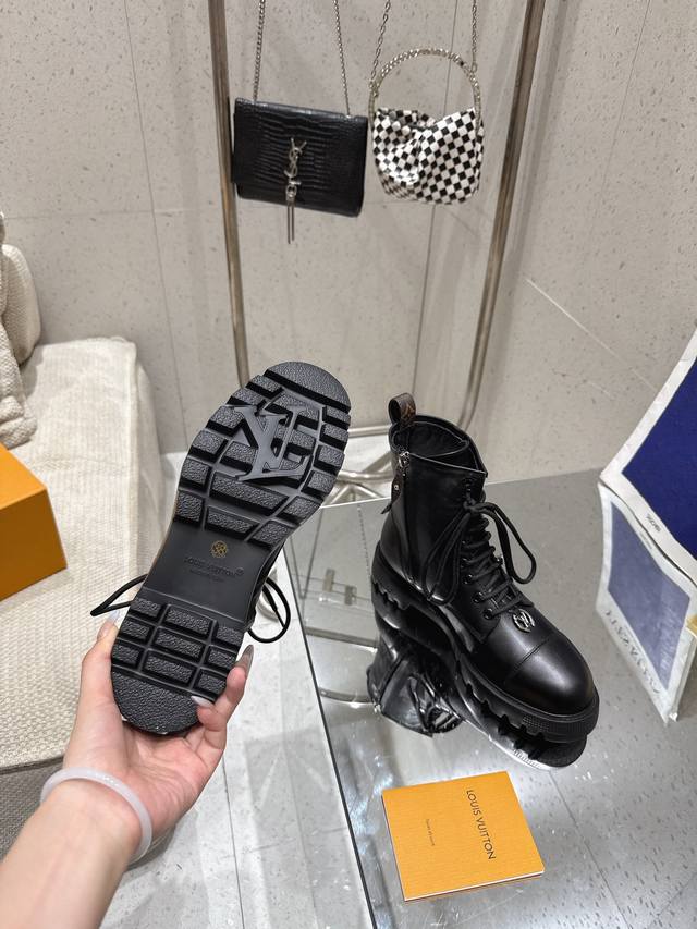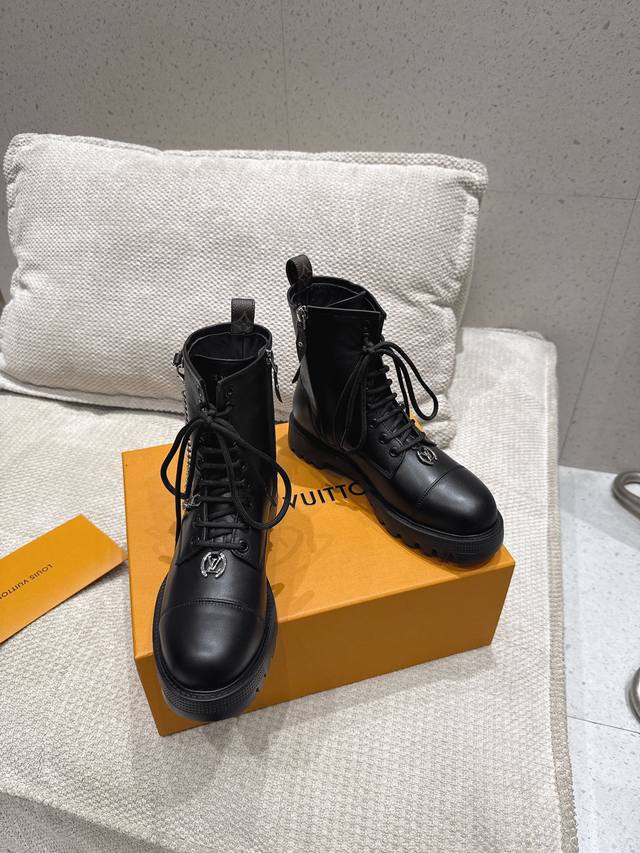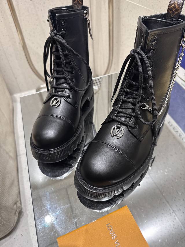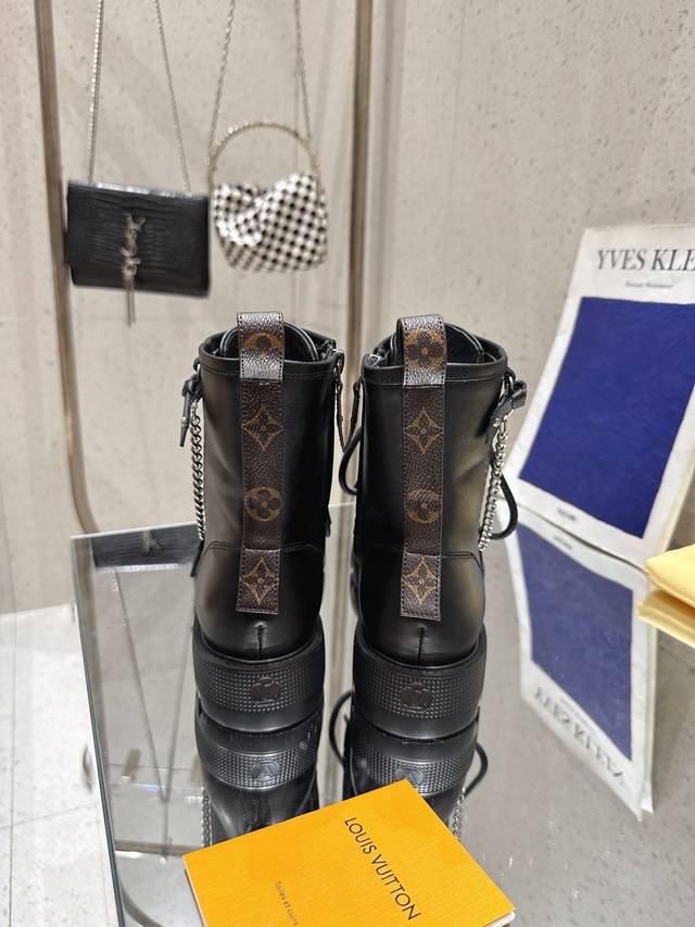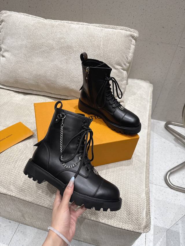 系带及踝靴 作为路易威登颇为瞩目的设计之一,本款 Star Trail 及踝靴以 Monogram 牛皮构筑经典造型。牛皮革饰边为军旅气质注入时尚格调,搭配金属链条和粗粝厚底。 鞋面:进口牛皮 内里: 羊皮内里 大底:原版大底 跟高:3Cm 鞋码: 35-41 40.41定做不退换