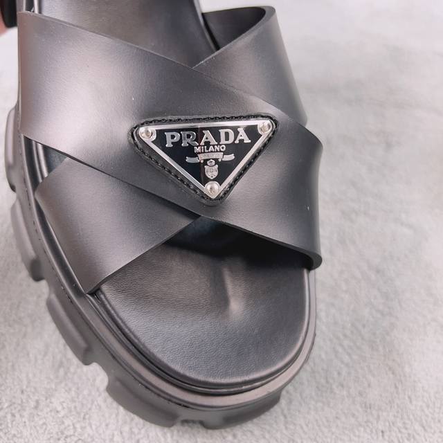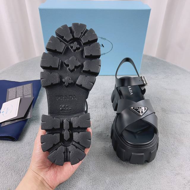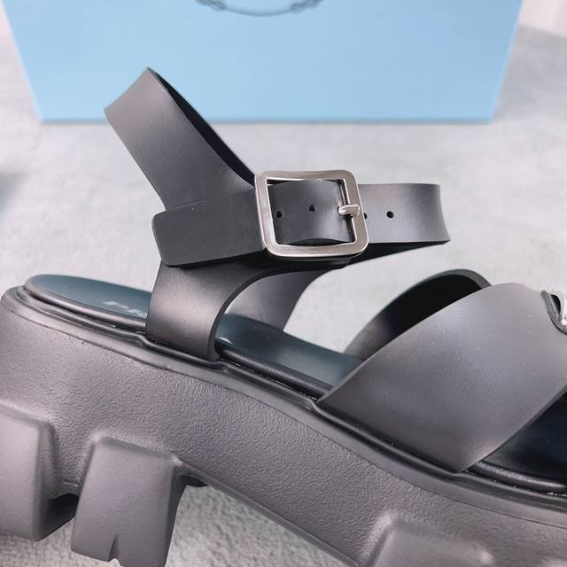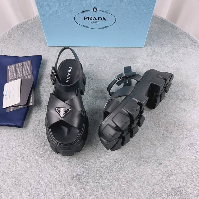 / 超火爆 Prada普拉达最新春夏锯齿罗马编织超轻厚底橡胶凉鞋 E64。复古时髦前卫的轮齿55Mm 厚底鞋底搭配橡胶鞋面,让整双鞋轻便舒适 鲜艳色彩 满足不同风格