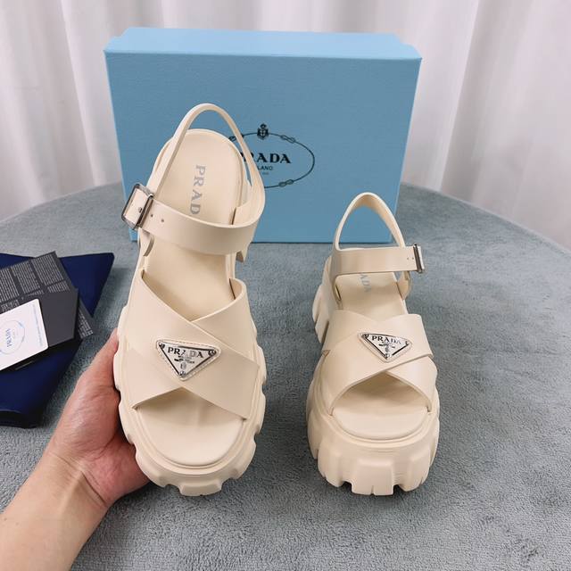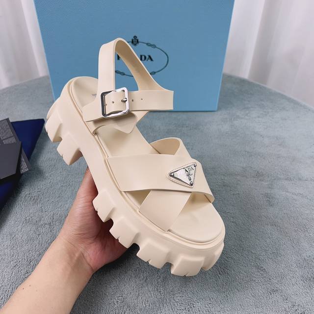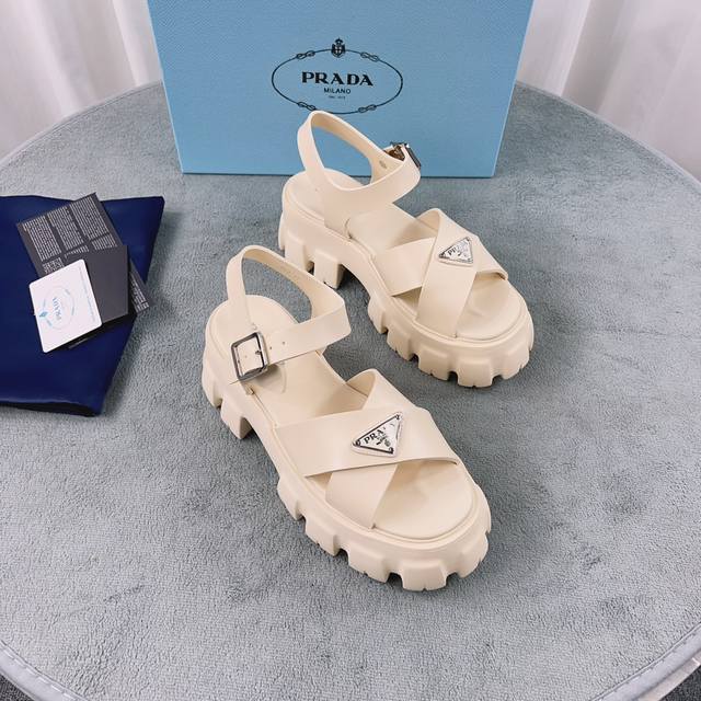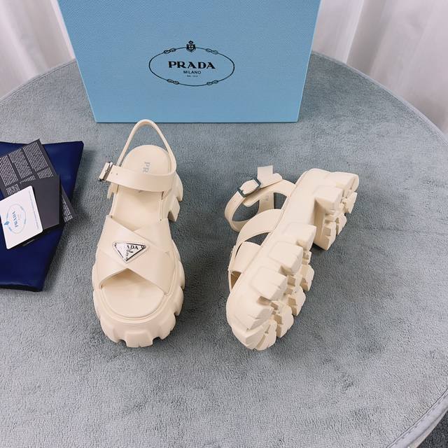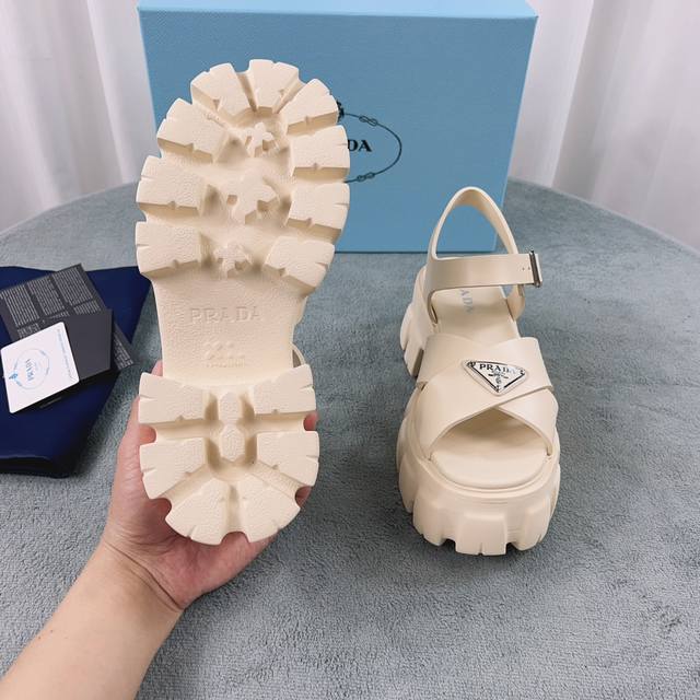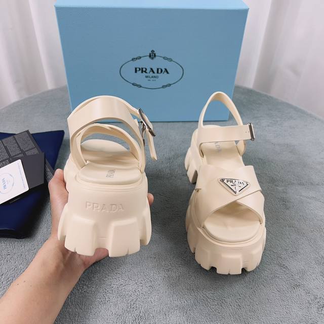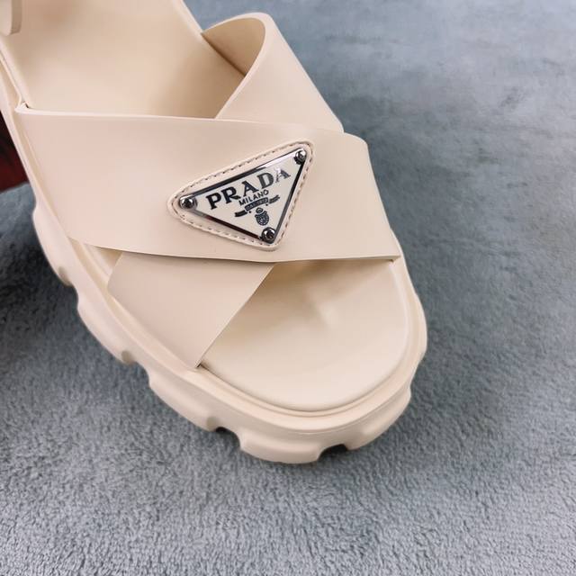 / 超火爆 Prada普拉达最新春夏锯齿罗马编织超轻厚底橡胶凉鞋 E64。复古时髦前卫的轮齿55Mm 厚底鞋底搭配橡胶鞋面,让整双鞋轻便舒适 鲜艳色彩 满足不同风格
