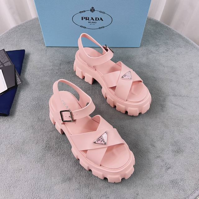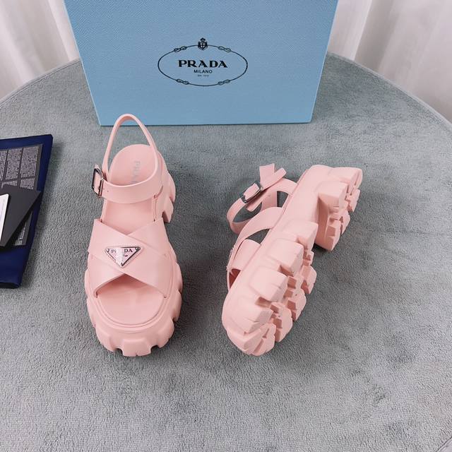 / 超火爆 Prada普拉达最新春夏锯齿罗马编织超轻厚底橡胶凉鞋 E64。复古时髦前卫的轮齿55Mm 厚底鞋底搭配橡胶鞋面,让整双鞋轻便舒适 鲜艳色彩 满足不同风格
