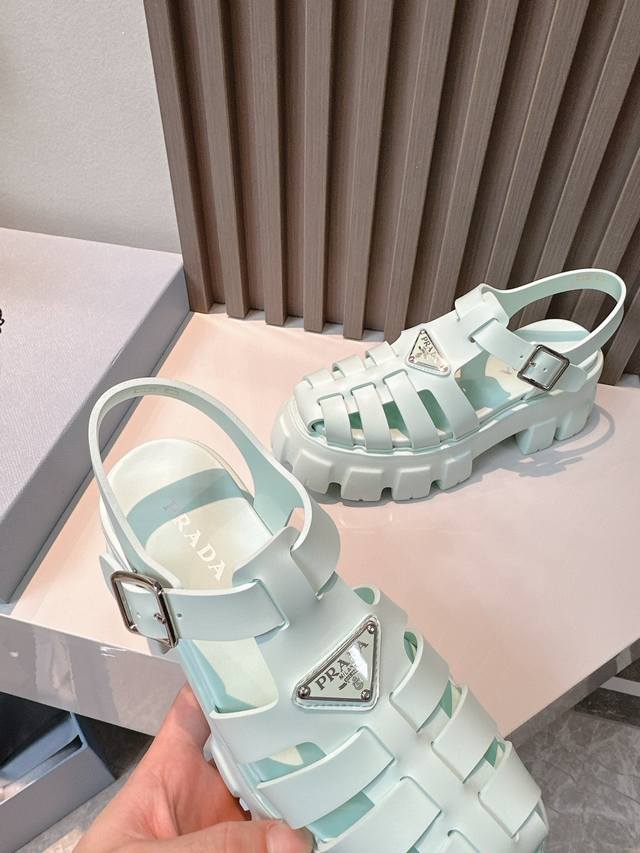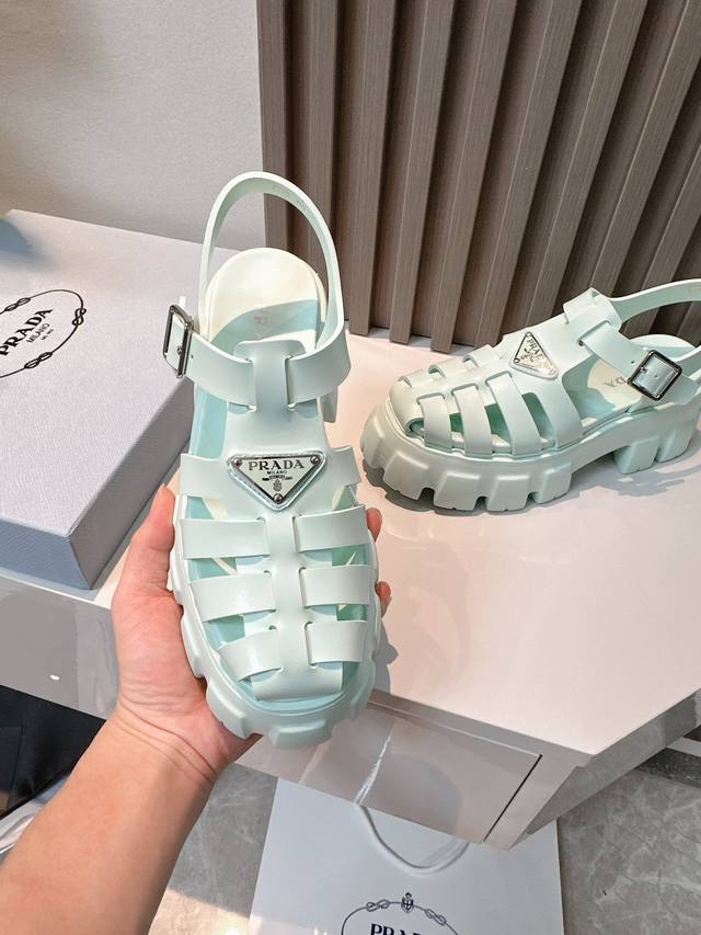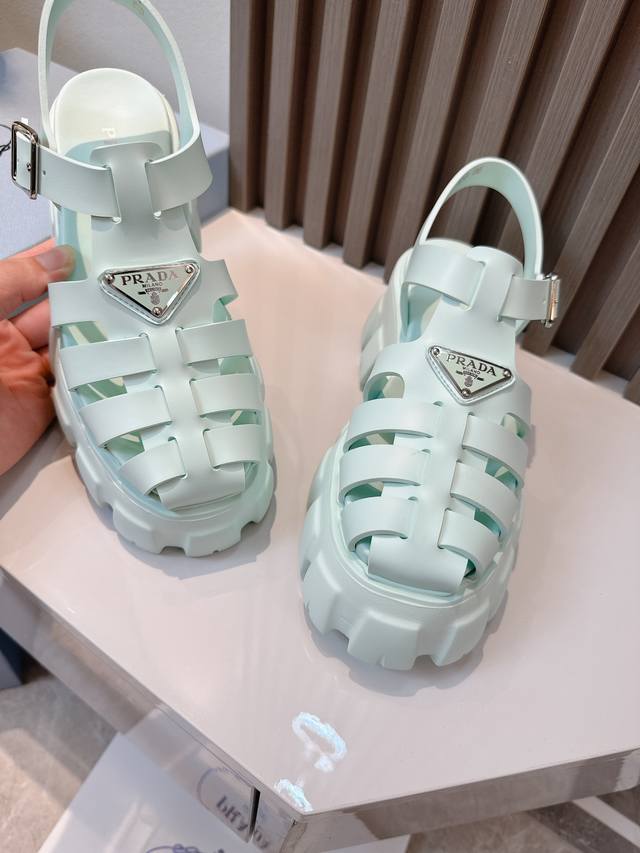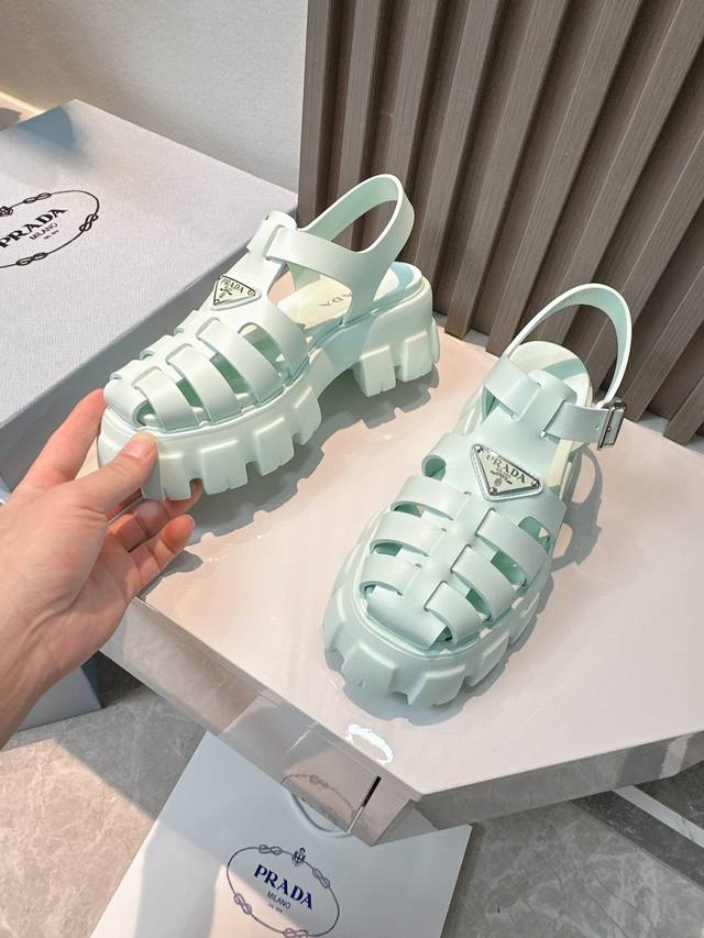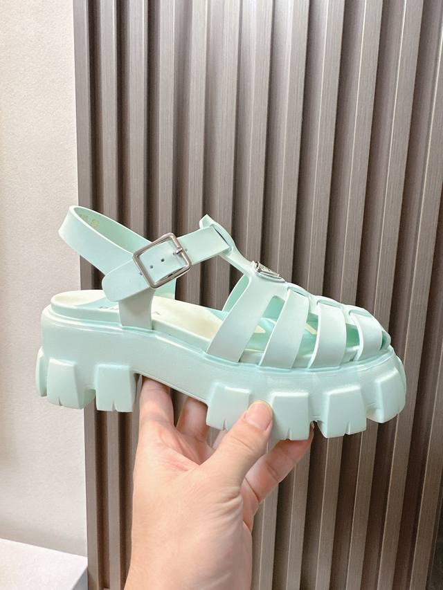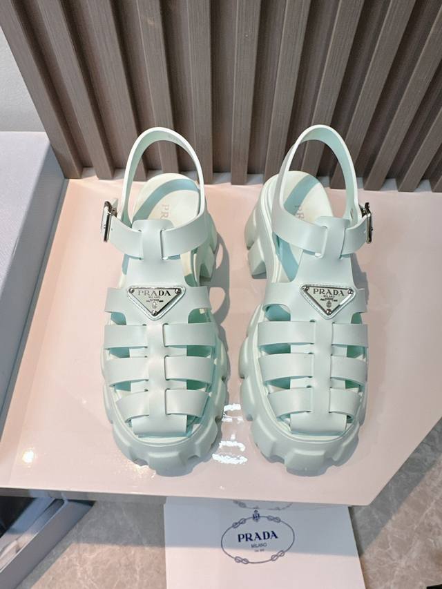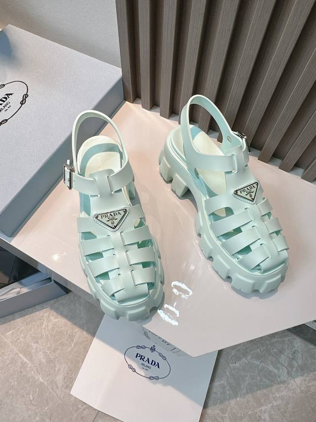 超火爆 Prada普拉达 最新春夏锯齿罗马编织厚底橡胶凉鞋 E64。复古时髦前卫的轮齿55Mm 厚底鞋底搭配橡胶鞋面,让整双鞋轻便舒适 鲜艳色彩 满足不同风格时髦人士的多种选择! 标志性金属三角标搭配古沙滩凉鞋造型,每一个设计元素都踩在时髦点上! 码数35-40