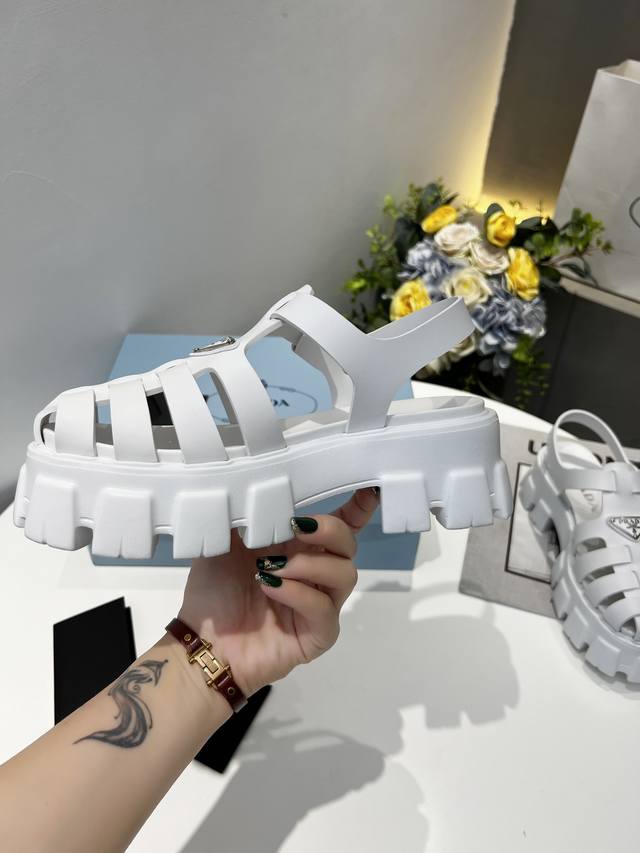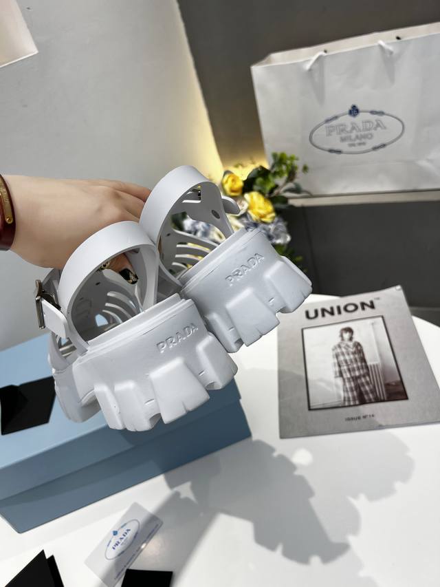 / 超火爆 Prada普拉达 最新春夏锯齿罗马编织厚底橡胶凉鞋 E64。复古时髦前卫的轮齿55Mm 厚底鞋底搭配橡胶鞋面,让整双鞋轻便舒适 鲜艳色彩 满足不同风格时