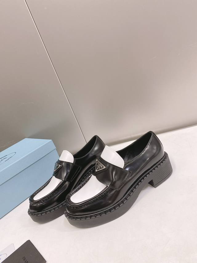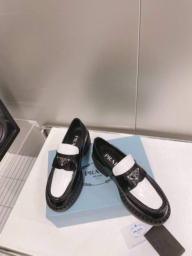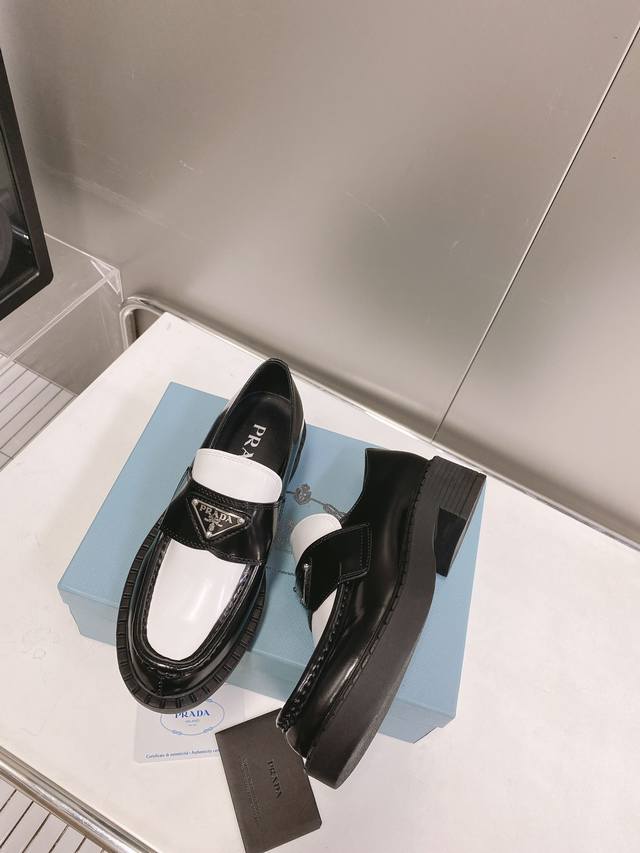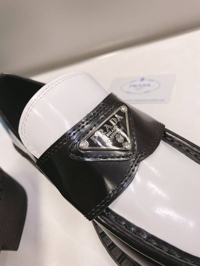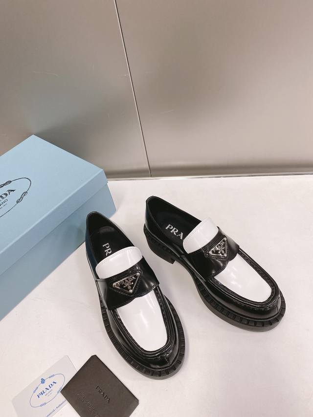 / 这个颜色只接订单 普拉达Ss22 P家 熊猫三角标乐福鞋 黑白配色非常醒目,春夏搭配很好看哦 甄选小牛皮材质,软胶底,鞋底有一定厚度,超显腿长!绝绝子 Size