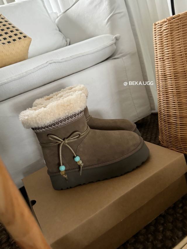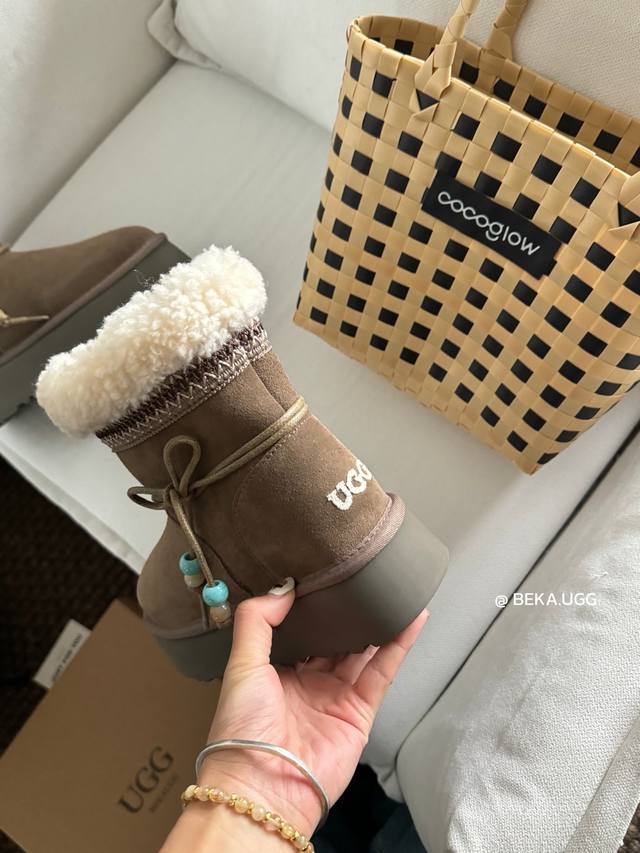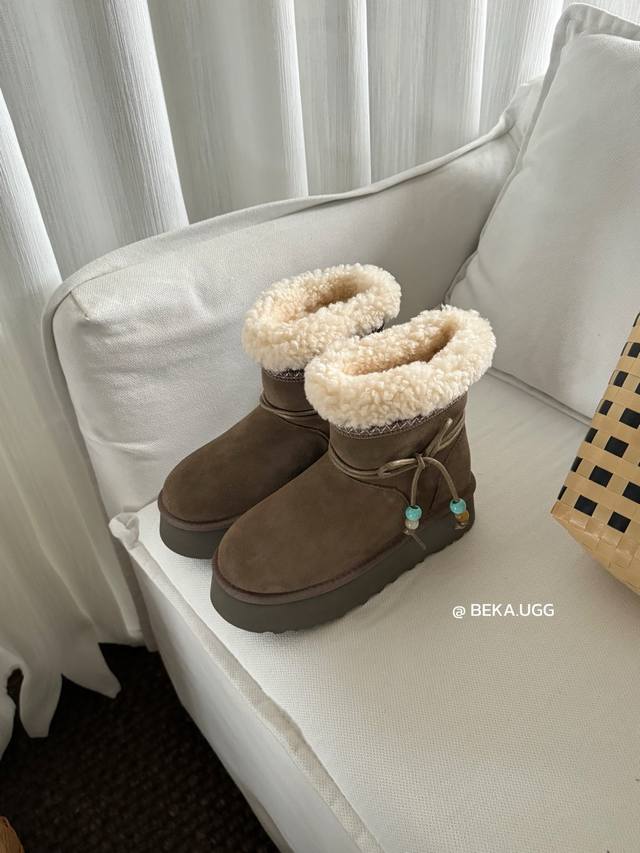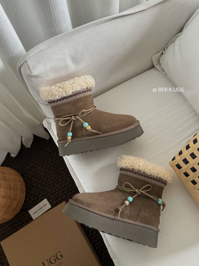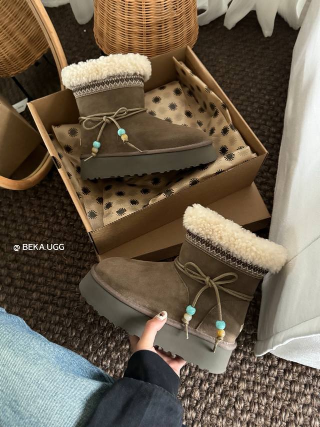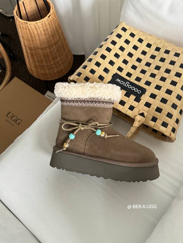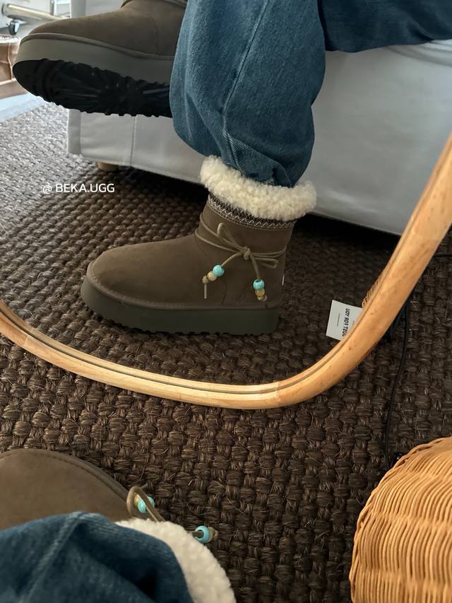 / 雪地靴炒鸡好看的圣诞款 民族风串珠两穿厚底,一眼就上头的款式 胖胖的方圆头鞋羊毛边边Logo 民族风花边设计 她怎么那么好看 Col:栗色 奶杏 胡桃木 Siz