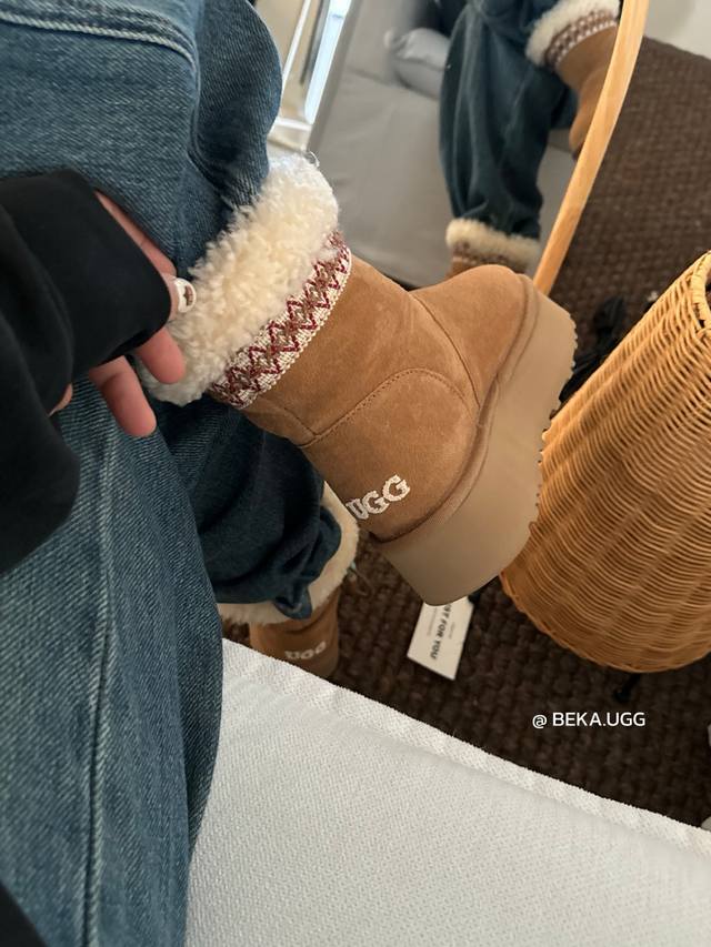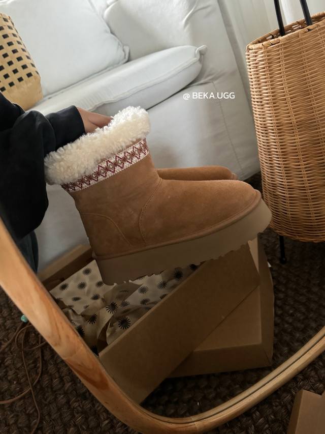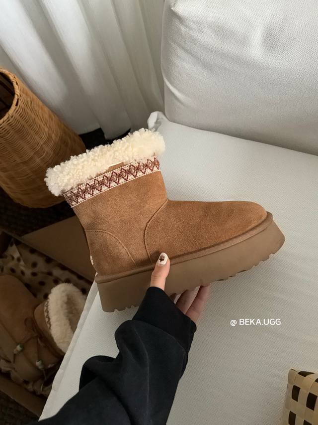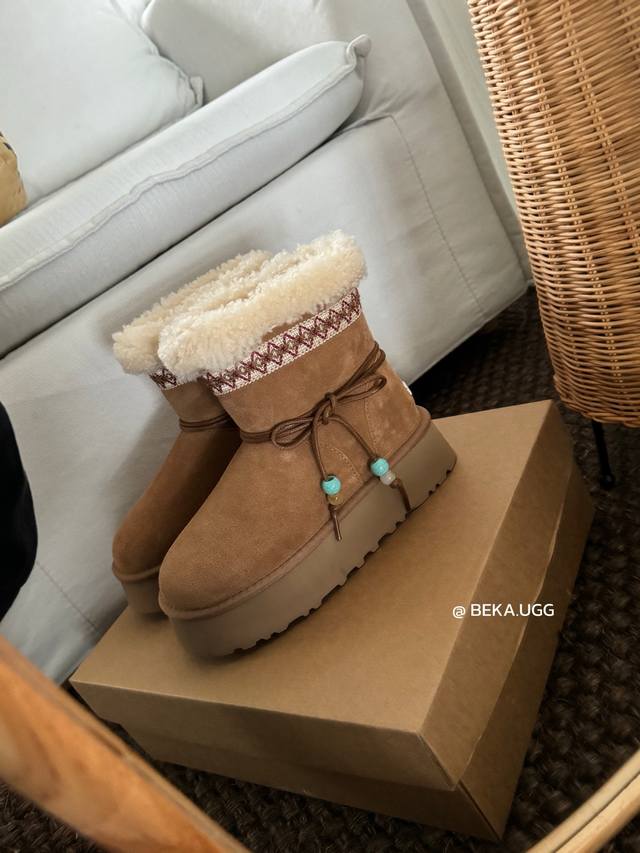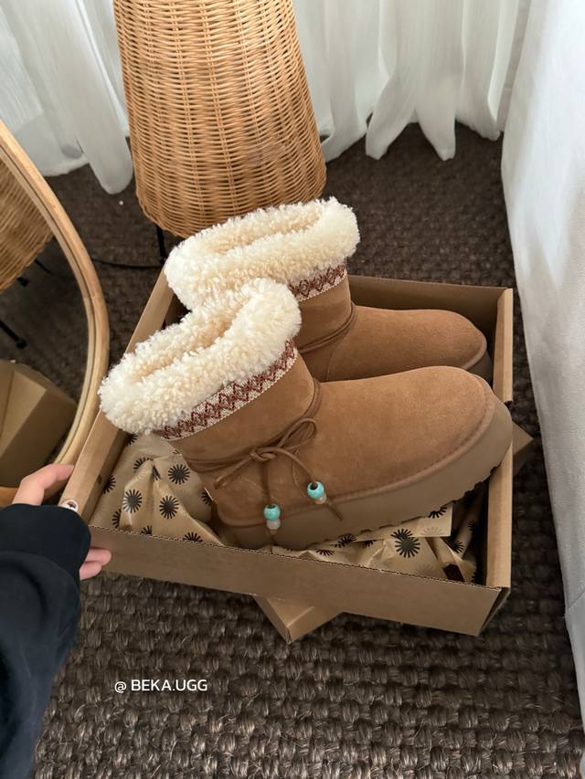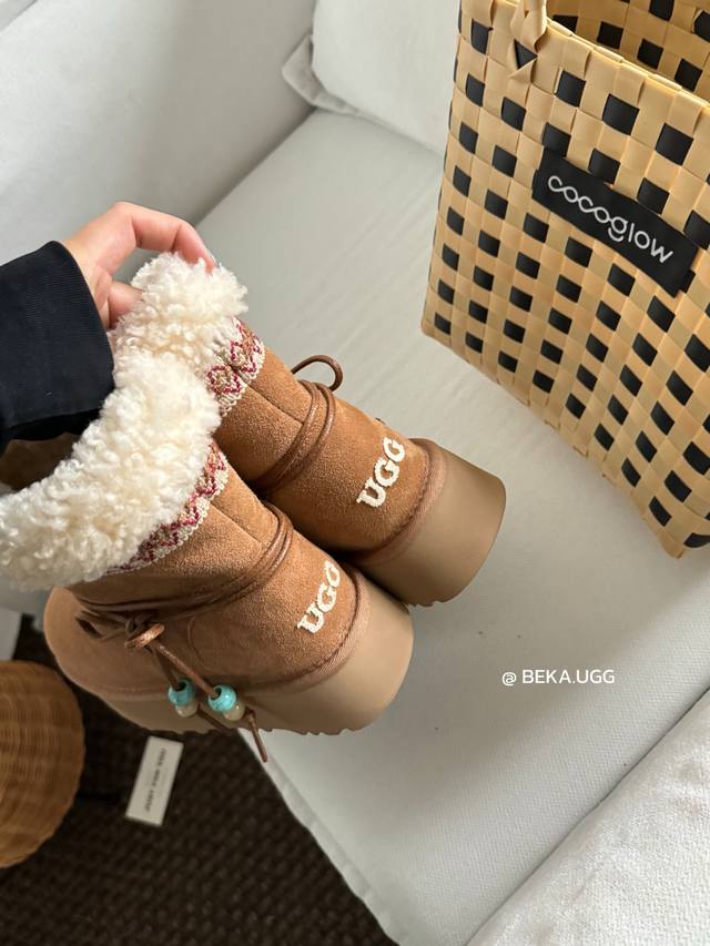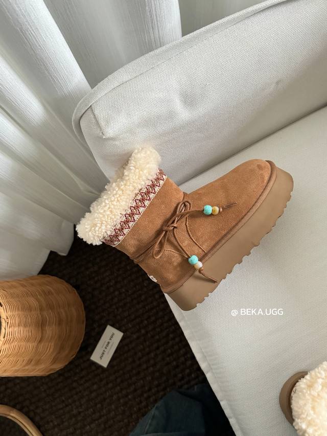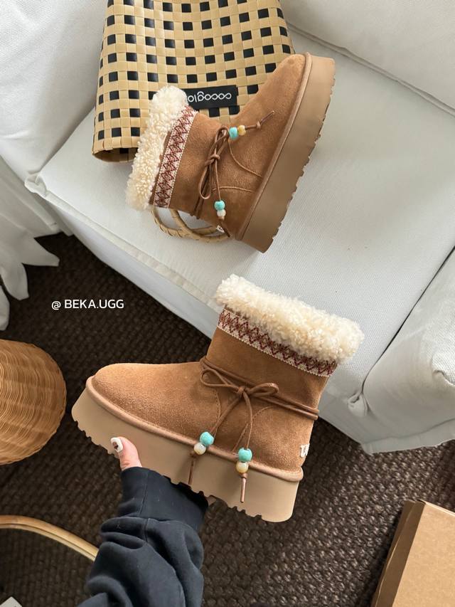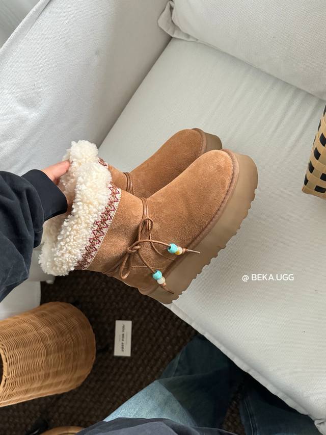 / 雪地靴炒鸡好看的圣诞款 民族风串珠两穿厚底,一眼就上头的款式 胖胖的方圆头鞋羊毛边边Logo 民族风花边设计 她怎么那么好看 Col:栗色 奶杏 胡桃木 Siz