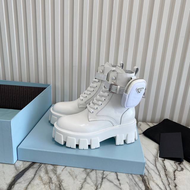 顶级出厂 Sss重磅推出普拉达最新包包短靴厚底系列 Prada早春T台走秀网红同款"造梦不夜城",Prada能在重要场合上用得上了,小清新风带点贵气的感觉,上脚非常完美穿搭配上此鞋,优雅大方,晶莹剔透,无论各种配件材质,都是独家一比一定制,必做到原版零距离,整个系列都充满了令人兴奋和意外的元素结合,不同的材质,肌理的面料的表现,具有极浓的艺术气息,让你领略Prada女孩的百变风格。 1鞋面:哑光进口开边朱,亮光软漆皮 2内里:进口羊皮内里 3大底:意大利原版原色Tpu 4原垫脚,码数35M-40M