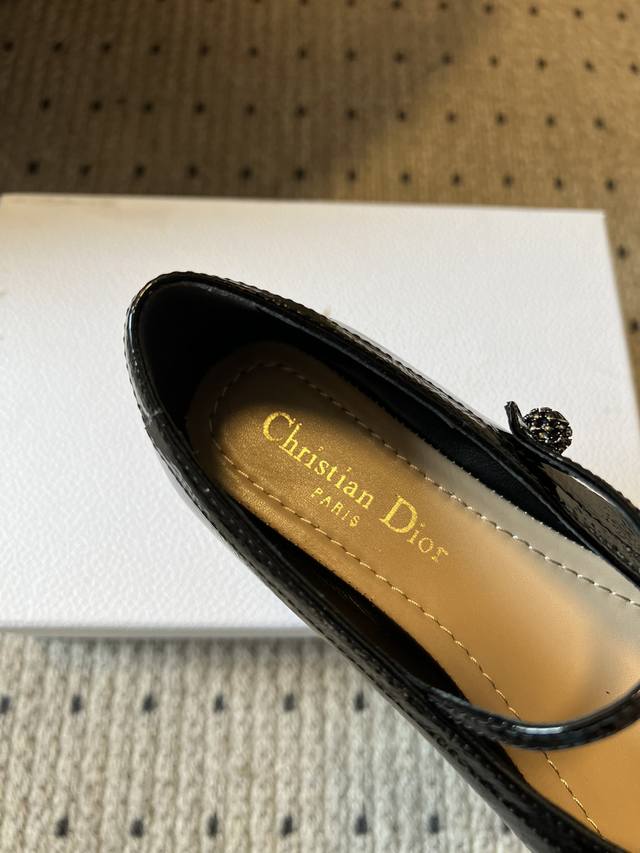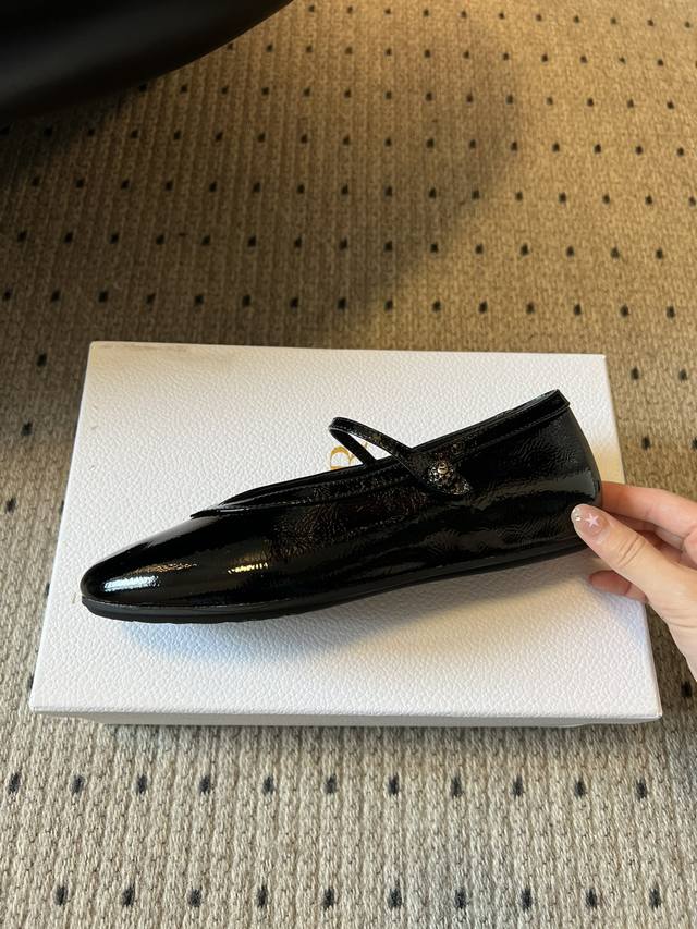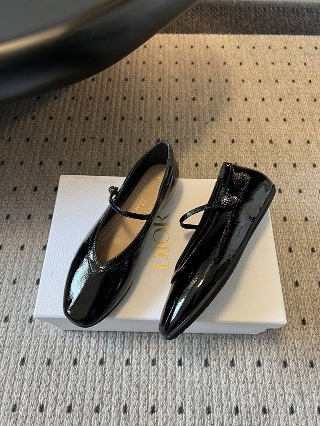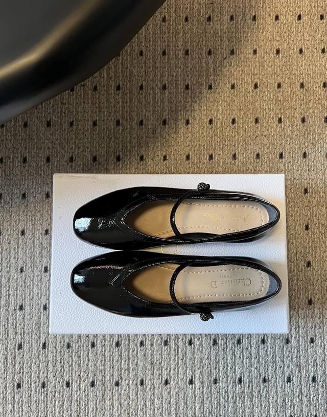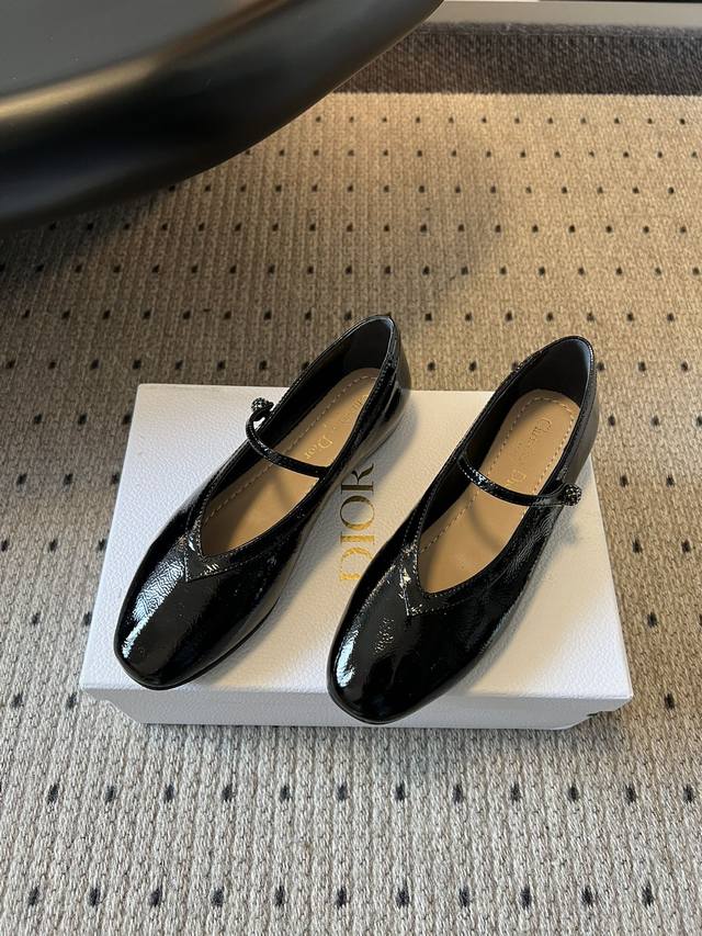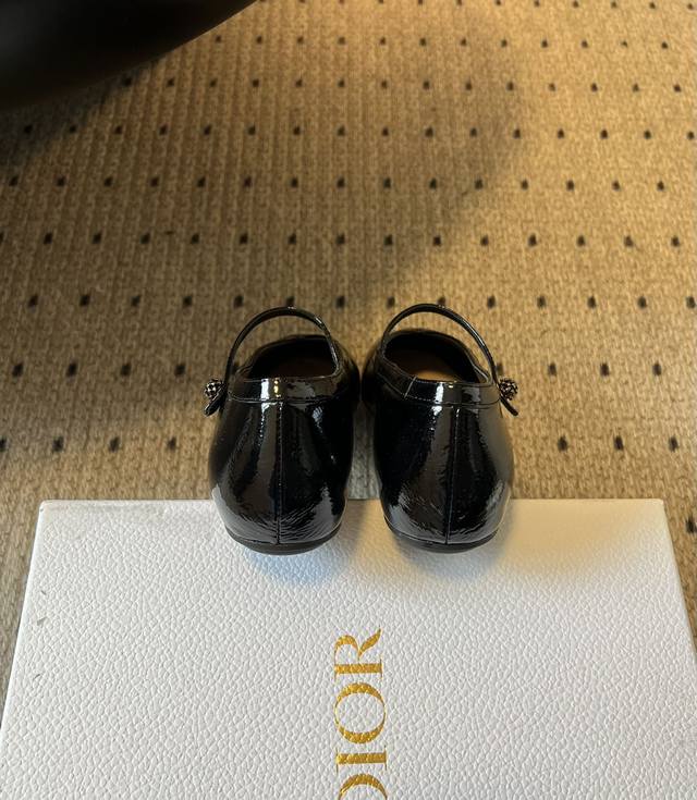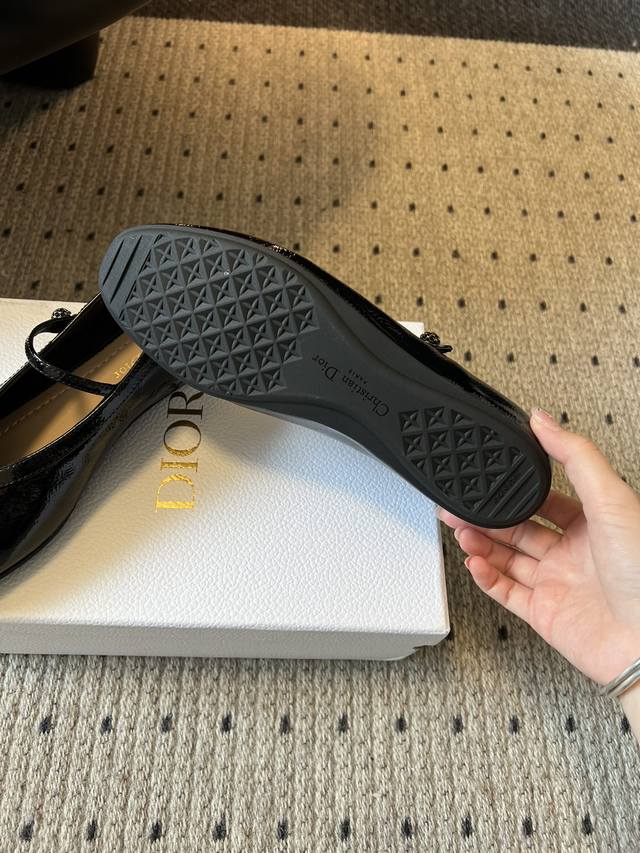 顶级品质 Dior 25Ss秋冬新品V芭蕾舞鞋 这款 Dior New Ballet 芭蕾鞋是二零二五秋冬成衣系列新品,彰显时尚感。黑色褶皱漆皮牛皮革款式,杏仁形鞋头和利落剪裁的鞋面设计彰显个性风格,饰带上点缀以一颗精心雕刻的饰以 Cd 标志的银色饰面金属珠饰,其灵感来自经典的 Dior Tribales 耳环。款式柔软舒适,搭配加垫皮革内底,可为休闲造型增添优雅的点睛之笔 鞋面:原版定制皱漆牛皮 丝绒 里衬:A级羊皮 加垫牛皮革内底 弹力皮革饰带搭配装饰性 Cd 金属珠饰 原版胶质鞋底|饰以Christ