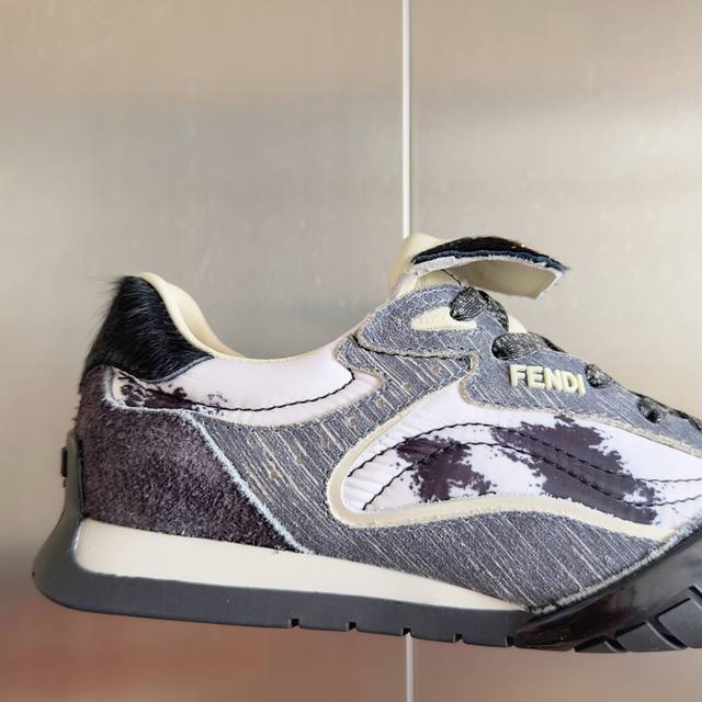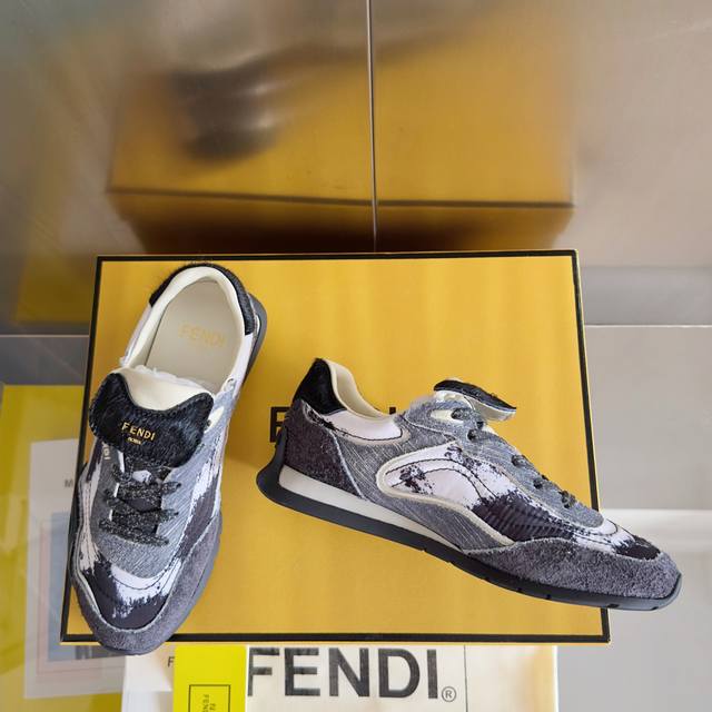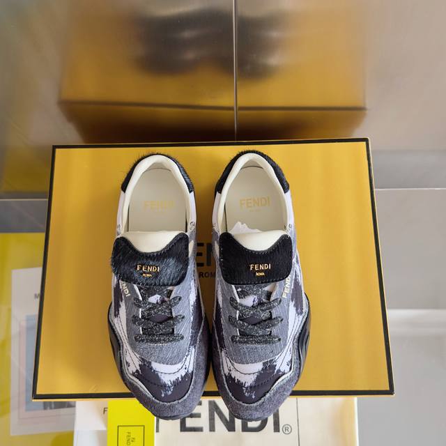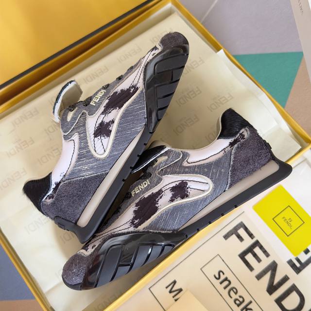顶级版本:女款440男款 Fendi芬迪 Wave Pulse系列 喷墨 翻盖 马毛 情侣款 休闲 运动鞋 阿甘鞋 Fendi Wave Pulse系带低帮运动鞋。高科技布料,饰灰色图形印花和同色系绒面材质嵌饰。撞色黑色卡瓦利诺小牛皮细节,翻折鞋舌。灰色混色管状系带。侧面饰有三维橡胶标志,鞋舌饰有金色金属Fendi标志。黑色橡胶跑鞋鞋底,侧面采用环绕式边缘设计,饰有对角F图案 配送专柜精美包装 面料: 原版定制进口头层牛皮 内里: 原版定制柔软羊皮里 大底: 原版开模防滑Tpu材质 底厚: 2Cm Siz