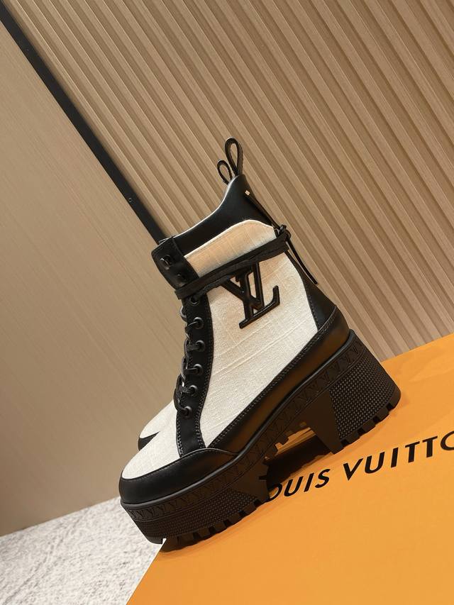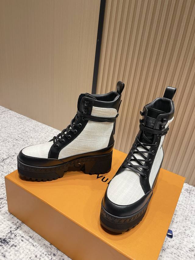 顶级版本: 高版本 Lv驴牌 经典高跟马丁靴 粗跟沙地靴系列 原版一比一复刻 可对比细节 楦形 材料 大底等 鞋面牛皮 老花皮拼接 羊皮里 整条鞋带都是真皮切条 跟高7Cm 水台3.5Cm 大气显瘦增高 好走不累脚 码数:35-40 41.42订
