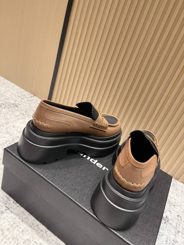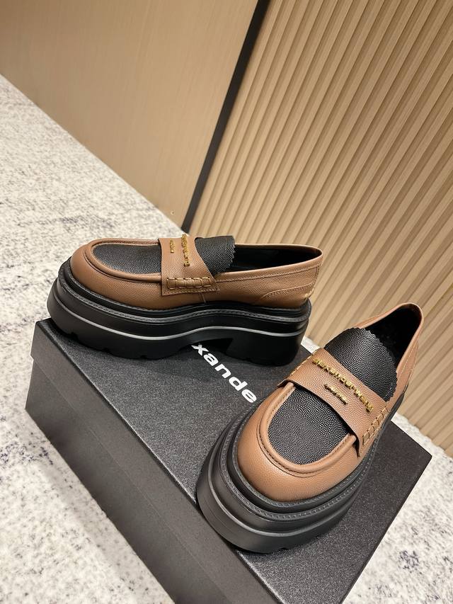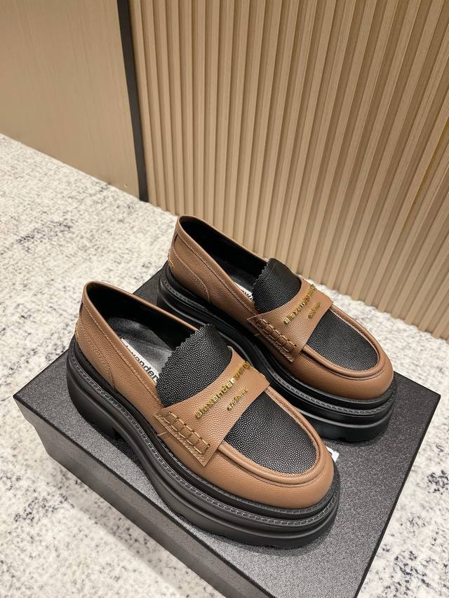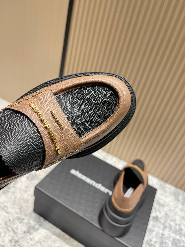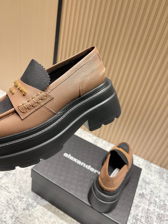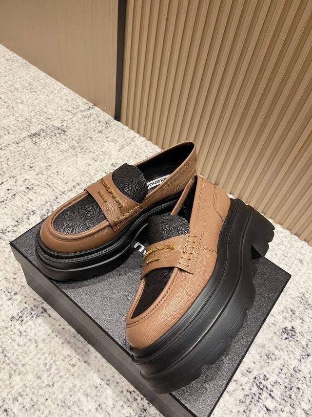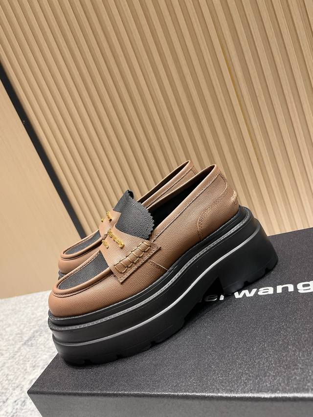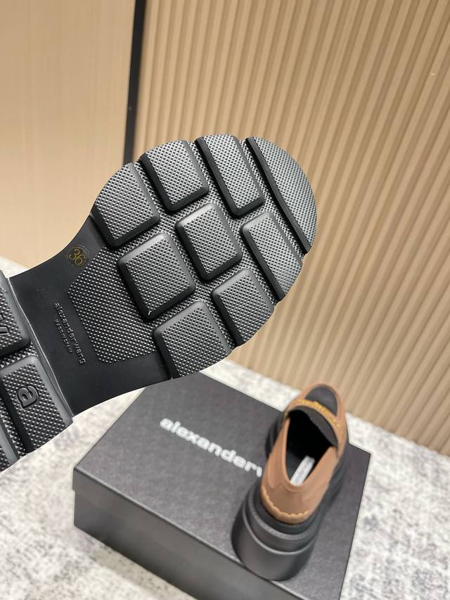 顶级版本: Alexande* Wang Aw Carter亚历山大王防水台松糕厚底乐福鞋 一脚蹬乐福鞋 Jennie 大王这双厚底乐福鞋好绝 Jennie近日出西果冻。同款乐福鞋来自压力山大王 Haileybieber撞鞋!这双炒股神器就是来袭Alexander Wang 2025秋冬最新款Carter厚底乐福鞋,绝对是腿精必备神器。 新款相比之前的老款和你家的显高显瘦,除了经典黑色外,还有酒红色,都是低调白搭的配色 亮皮皮哥搭配标志性的品牌金属徽标,加上7.5Cm厚底设计轻松拥有大长腿! 鞋面:原版开