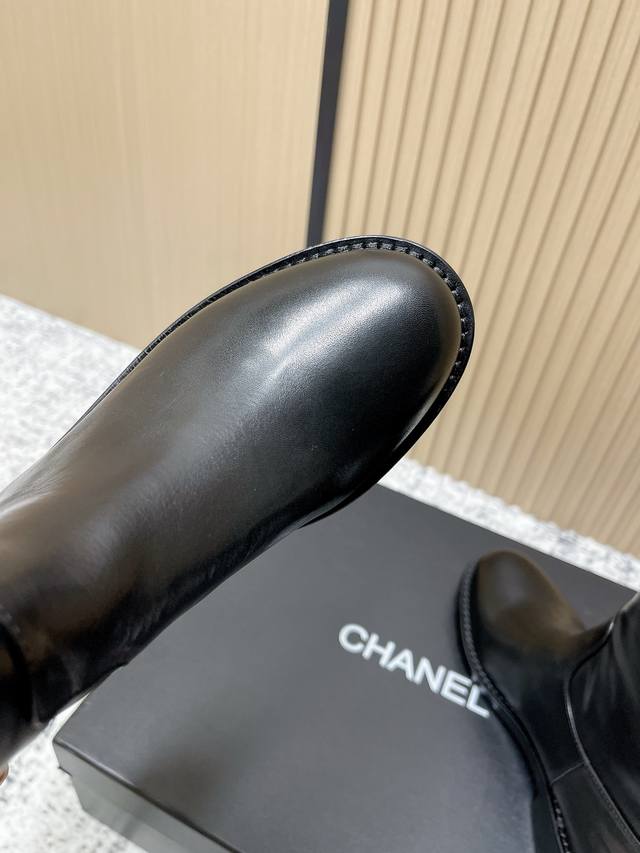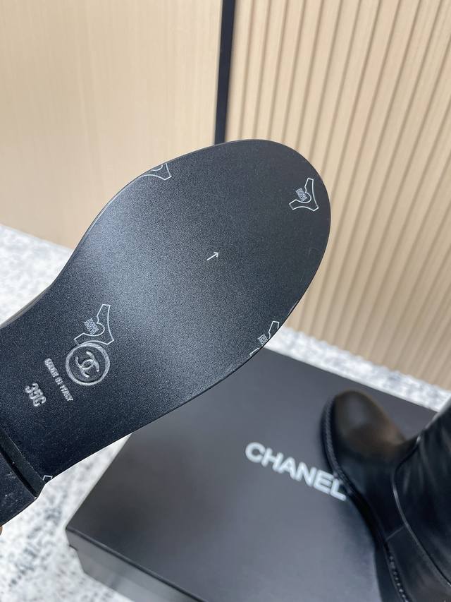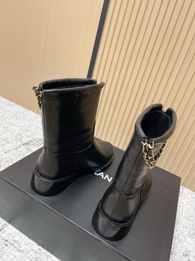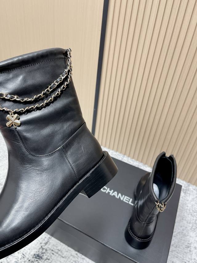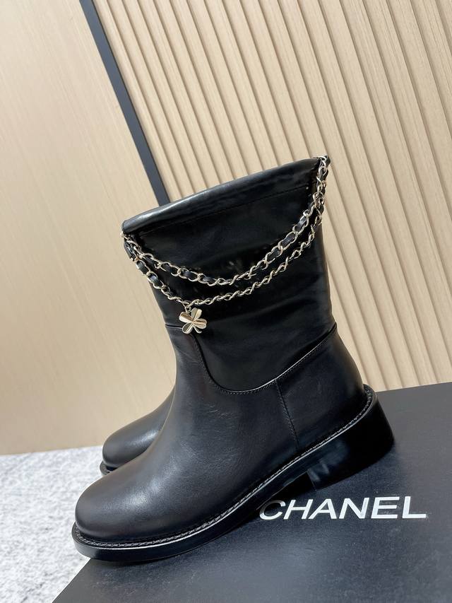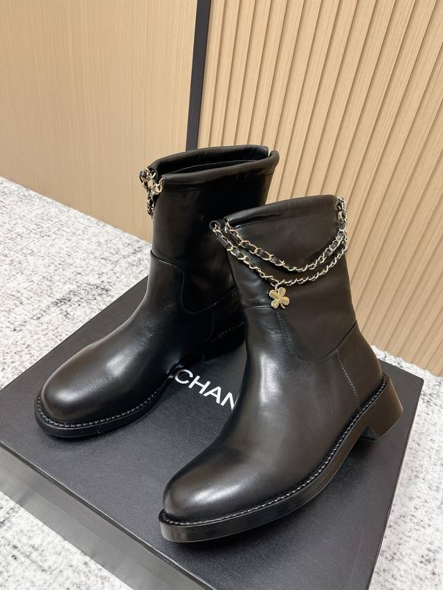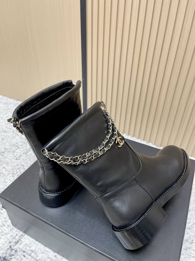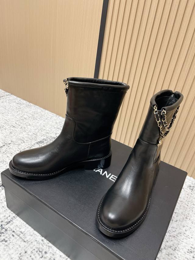 顶级版本: Chanel 香奈儿 2025秋冬新款朋克风格链条女短靴 小香字母Logo五金扣圆头低跟机车骑士靴 材质:鞋面进口小牛皮 进口羊猄皮+水染牛皮内里+