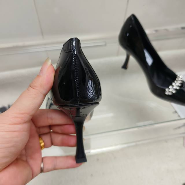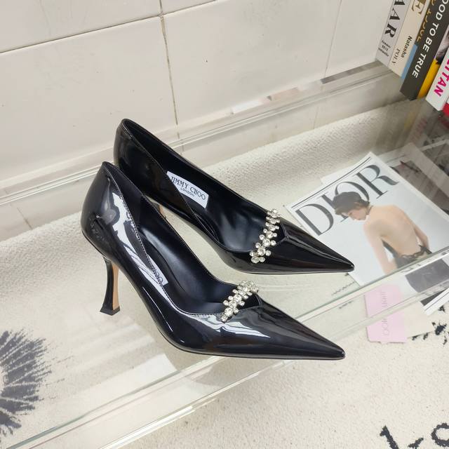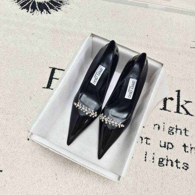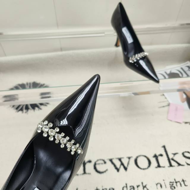 / 顶级版本 Jimmy Choo Belinda Pum 系列高跟鞋,以高光泽漆皮材质打造摩登鞋型。鲜明尖头设计配以9厘米高跟,精美水晶饰绑带微光熠熠,令双足尽显