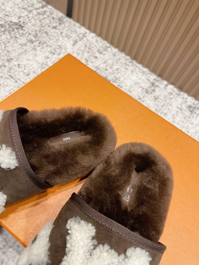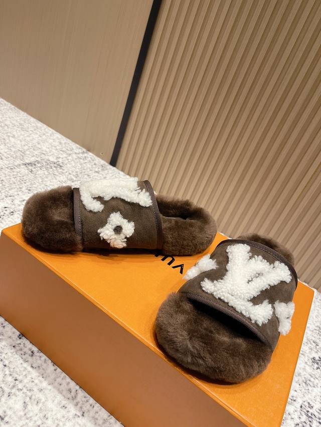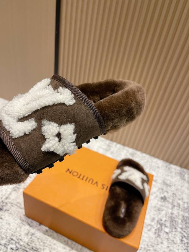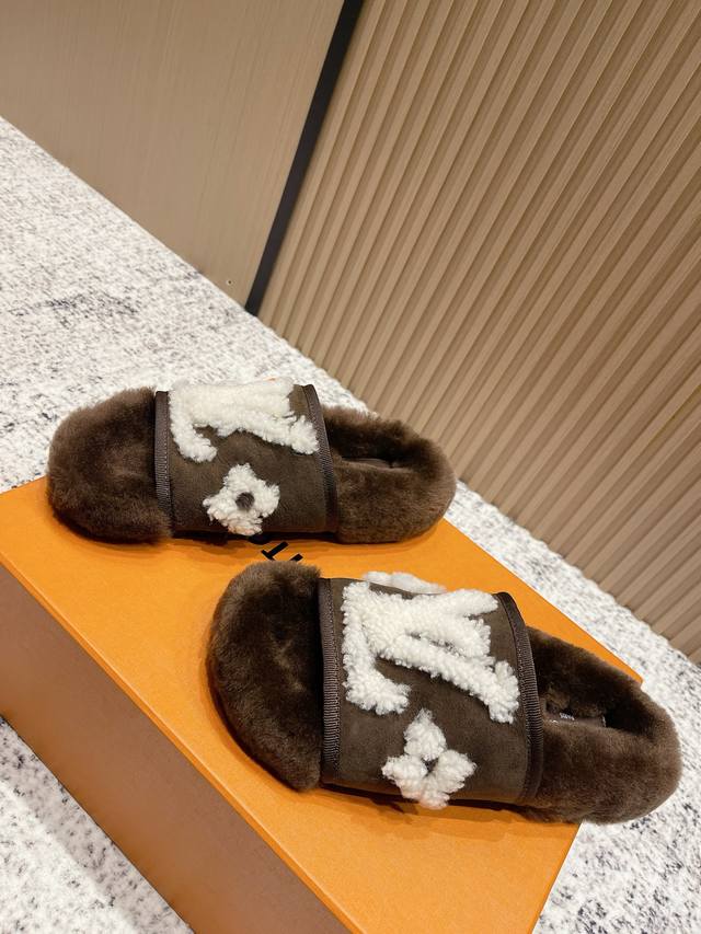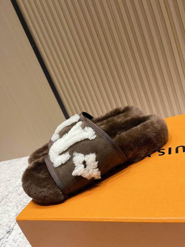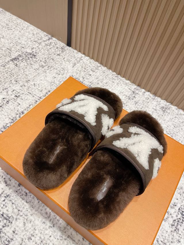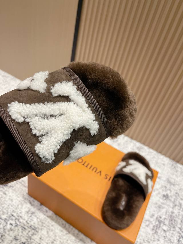 / 顶级版本: Lv~~羊毛拖,超级火的一款毛毛拖,毛鞋 纯羊毛被植入品牌元素后,百搭、时尚、潮款、懒人至爱,被完美释放 面料 内里 垫脚包底全是羊毛 拼接色Log
