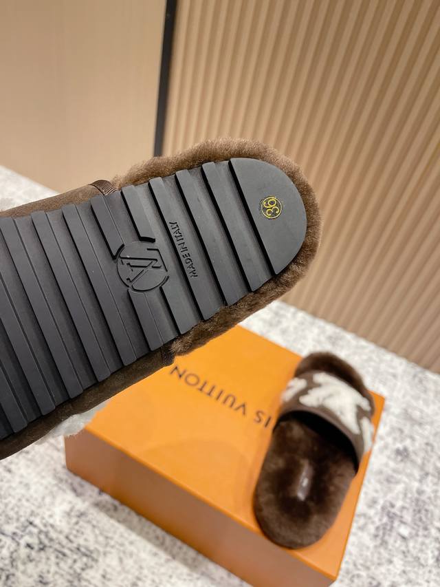 顶级版本: Lv~~羊毛拖,超级火的一款毛毛拖,毛鞋 纯羊毛被植入品牌元素后,百搭、时尚、潮款、懒人至爱,被完美释放 面料 内里 垫脚包底全是羊毛 拼接色Logo呈现奢侈名品,原版Tpu防滑大底