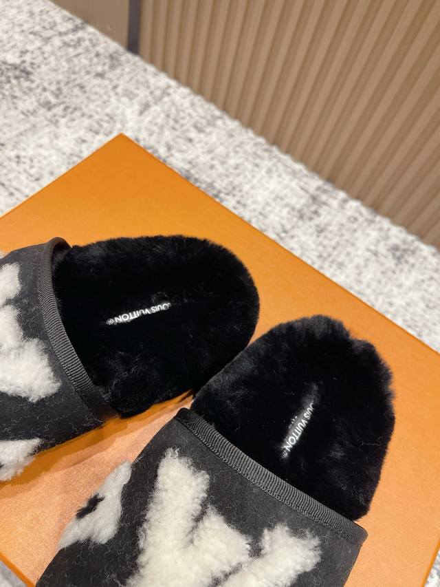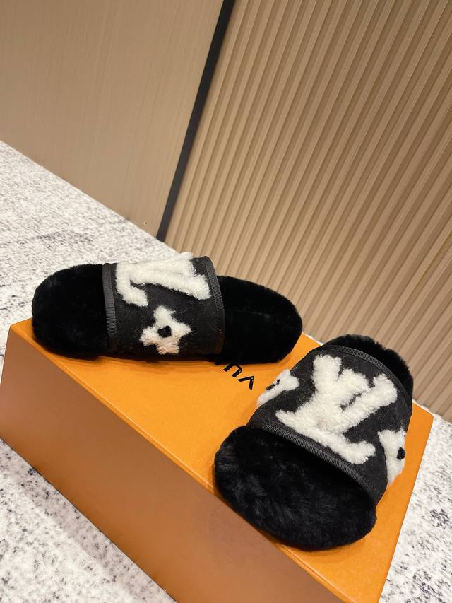 / 顶级版本: Lv~~羊毛拖,超级火的一款毛毛拖,毛鞋 纯羊毛被植入品牌元素后,百搭、时尚、潮款、懒人至爱,被完美释放 面料 内里 垫脚包底全是羊毛 拼接色Log