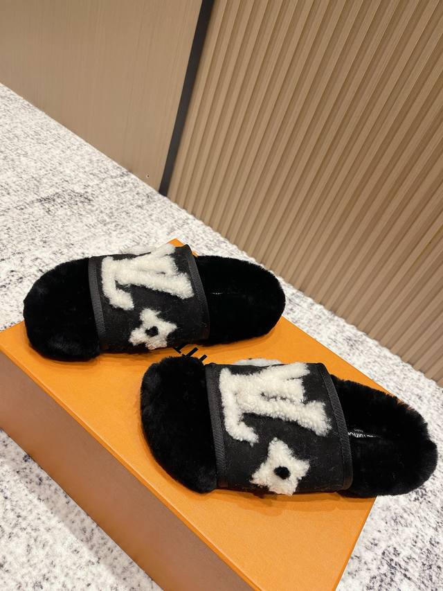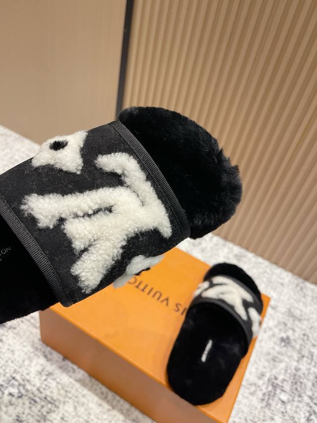顶级版本: Lv~~羊毛拖,超级火的一款毛毛拖,毛鞋 纯羊毛被植入品牌元素后,百搭、时尚、潮款、懒人至爱,被完美释放 面料 内里 垫脚包底全是羊毛 拼接色Log