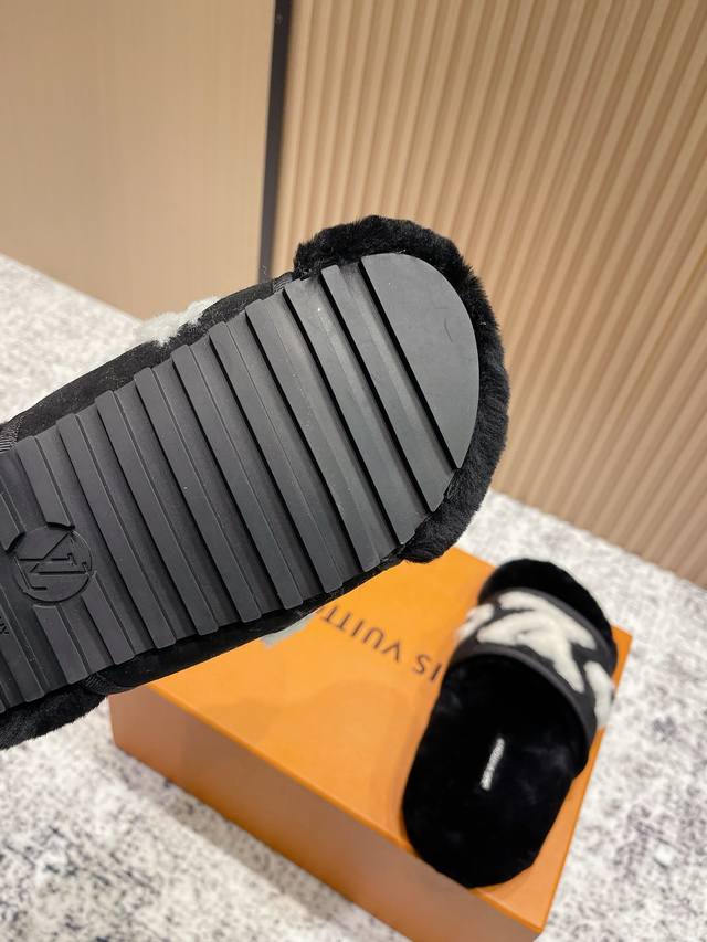顶级版本: Lv~~羊毛拖,超级火的一款毛毛拖,毛鞋 纯羊毛被植入品牌元素后,百搭、时尚、潮款、懒人至爱,被完美释放 面料 内里 垫脚包底全是羊毛 拼接色Logo呈现奢侈名品,原版Tpu防滑大底