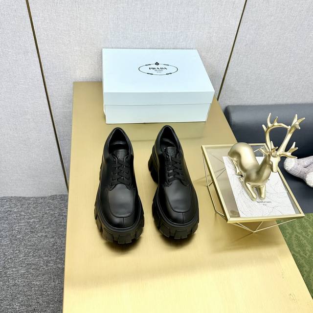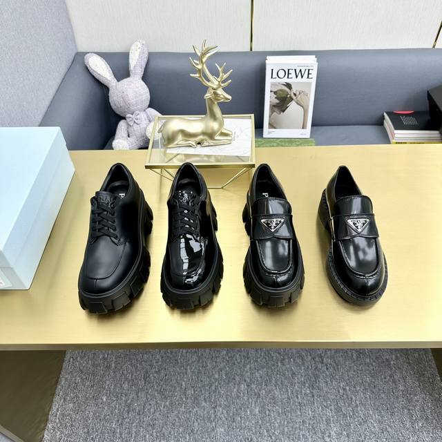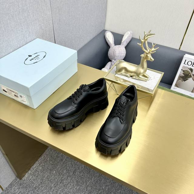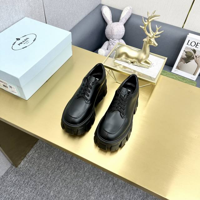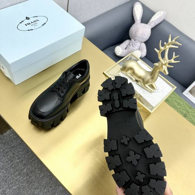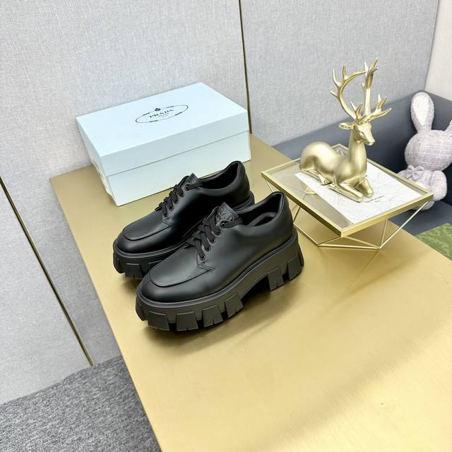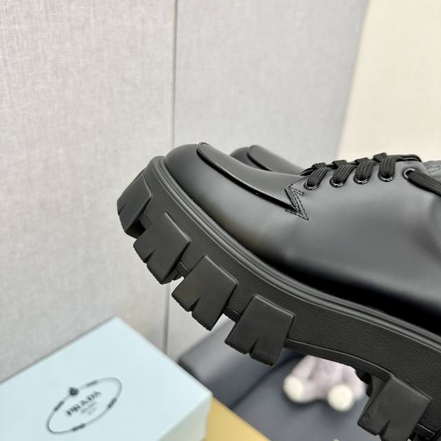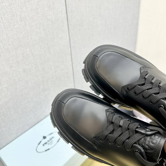 顶级版本, Prada 普拉达亮面皮革系带厚底乐福鞋 鞋面:开边珠涂珐琅金属三角形徽标 内里:牛皮内里 大底:呈轮胎凸纹多孔橡胶鞋底 跟高:5.5Cm 码数: