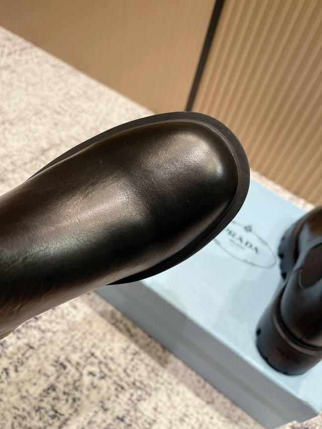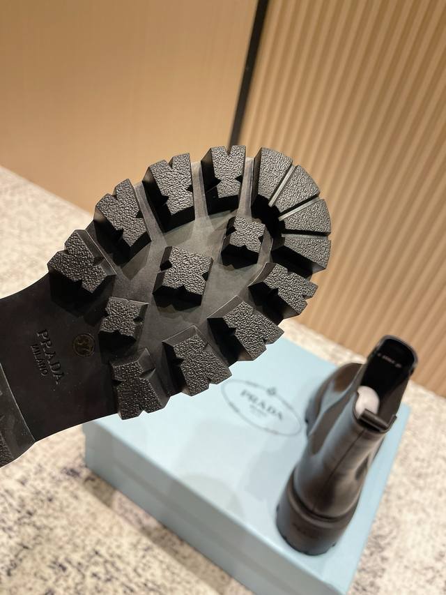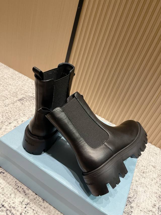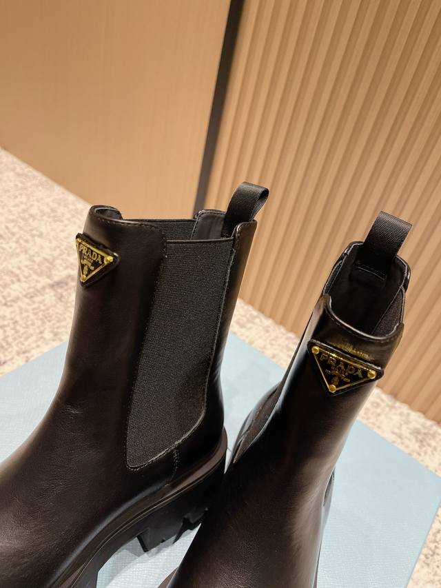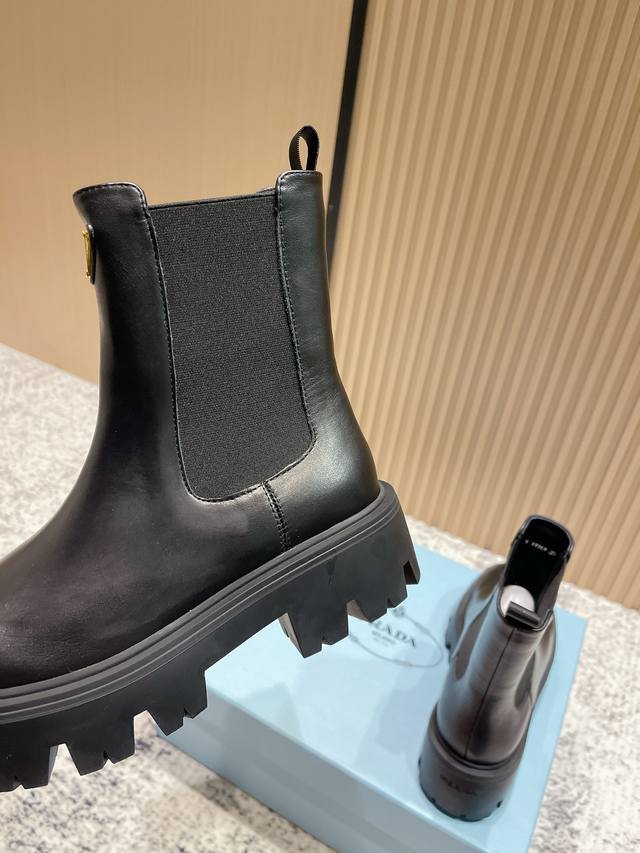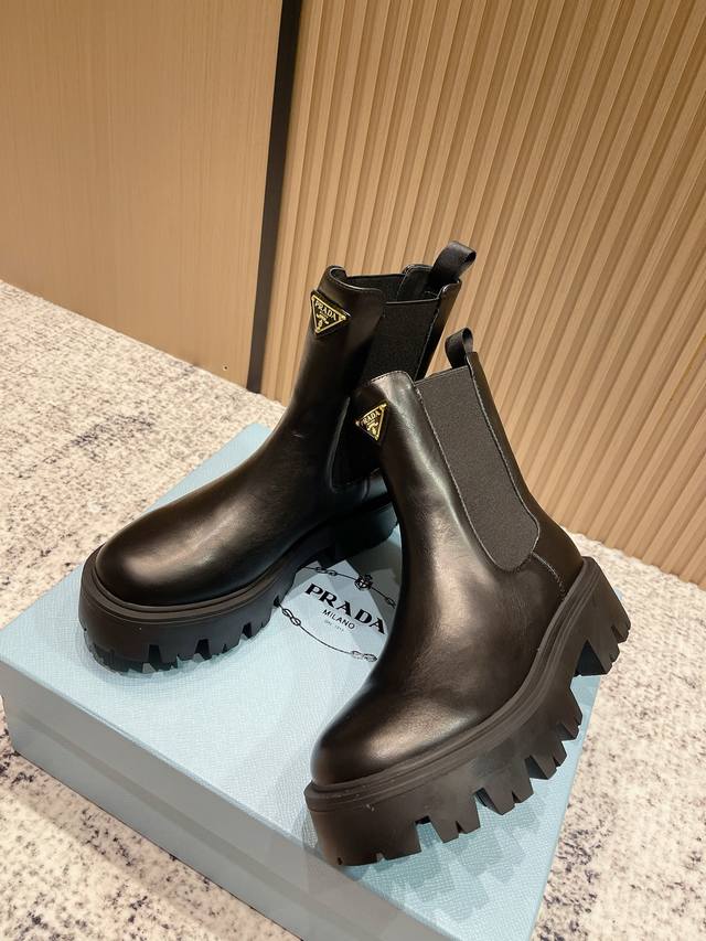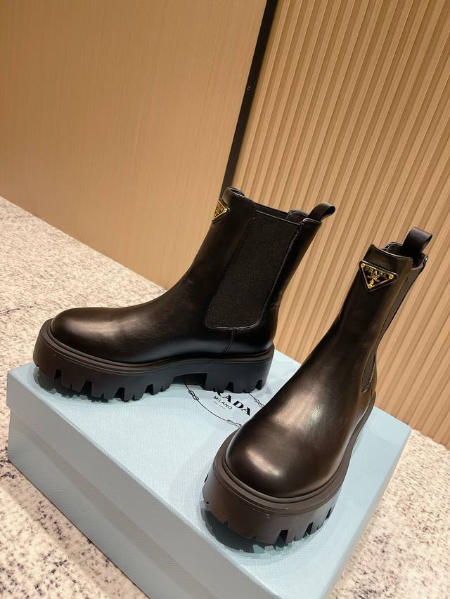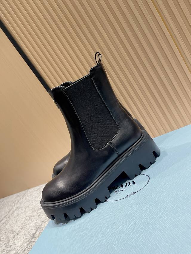 顶级版本: Prada 普拉达 25Fw最新厚底短筒靴 明星同款三角标扣一脚蹬厚底增高机车风松紧带短靴 经典线条与现代元素相结合,定义了此款风格多样的短靴。亮面牛皮革突显鞋履线条,搭配厚实鞋底,并饰以标志性的涂珐琅三角形金属徽标。 这款鞋履配有鲜明的圆形鞋头,橡胶厚底为经典乐福鞋注入现代外观,涂珐琅三角形金属徽标装饰彰显品牌格调。惯用于精美鞋履的复古亮面皮革经Prada系列重释,打造别具现代气息的混搭设计。 鞋面:牛皮 开边珠 内里垫脚:羊皮 鞋底:原版开模灌注工艺Tpu大底 底厚:5Cm 码数:35-3