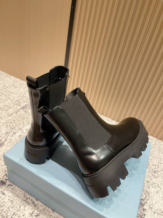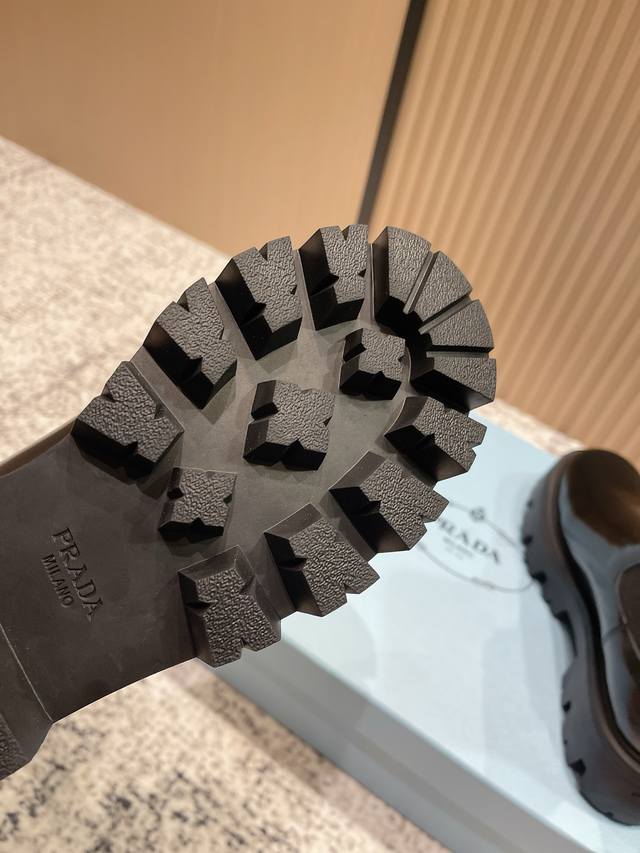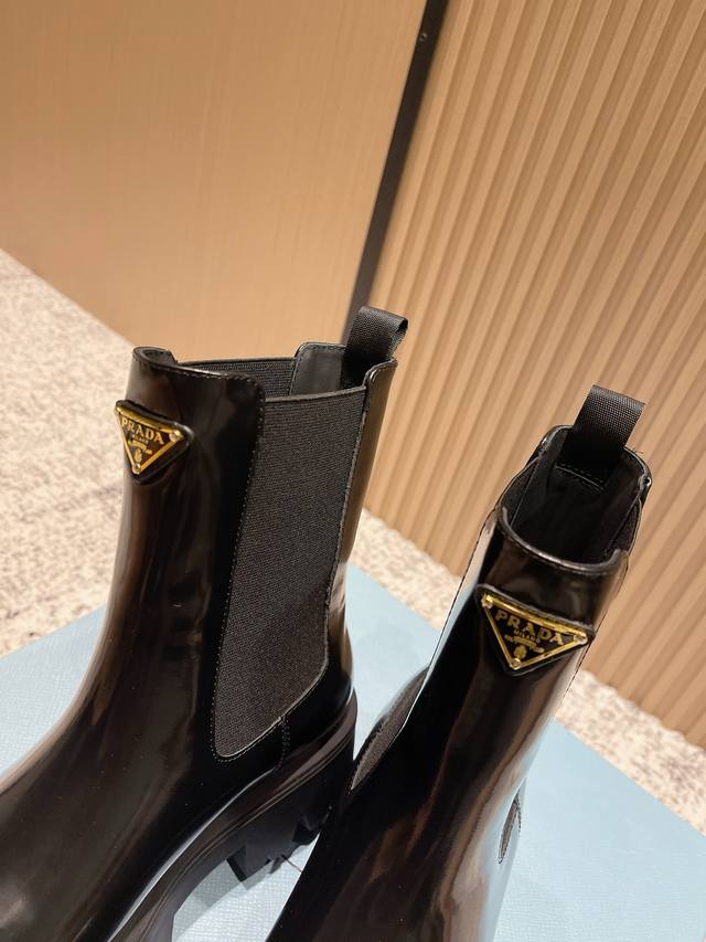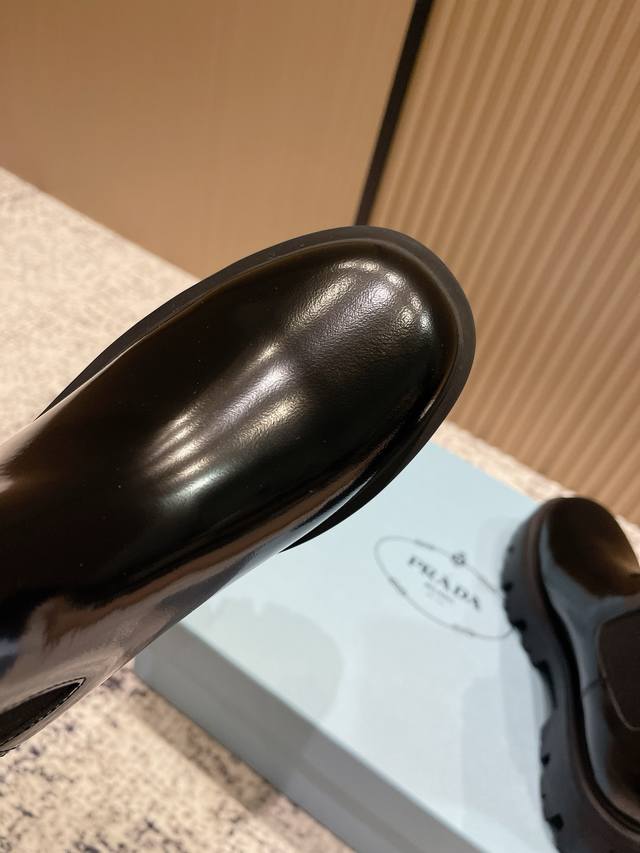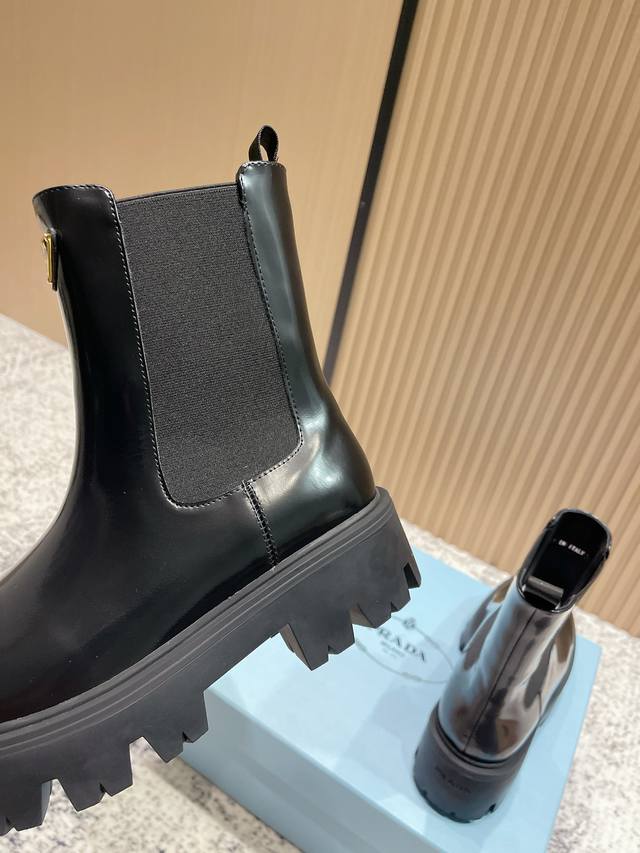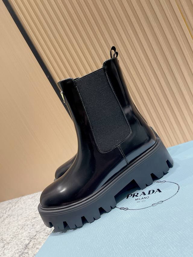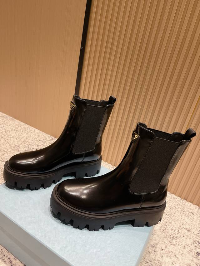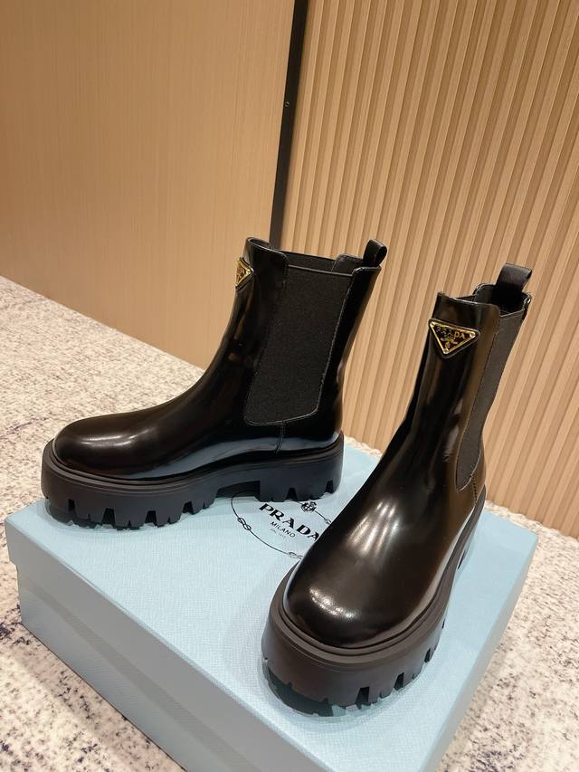 顶级版本: Prada 普拉达 25Fw最新厚底短筒靴 明星同款三角标扣一脚蹬厚底增高机车风松紧带短靴 经典线条与现代元素相结合,定义了此款风格多样的短靴。亮面牛皮革突显鞋履线条,搭配厚实鞋底,并饰以标志性的涂珐琅三角形金属徽标。 这款鞋履配有鲜明的圆形鞋头,橡胶厚底为经典乐福鞋注入现代外观,涂珐琅三角形金属徽标装饰彰显品牌格调。惯用于精美鞋履的复古亮面皮革经Prada系列重释,打造别具现代气息的混搭设计。 鞋面:牛皮 开边珠 内里垫脚:羊皮 鞋底:原版开模灌注工艺Tpu大底 底厚:5Cm 码数:35-3