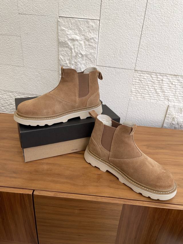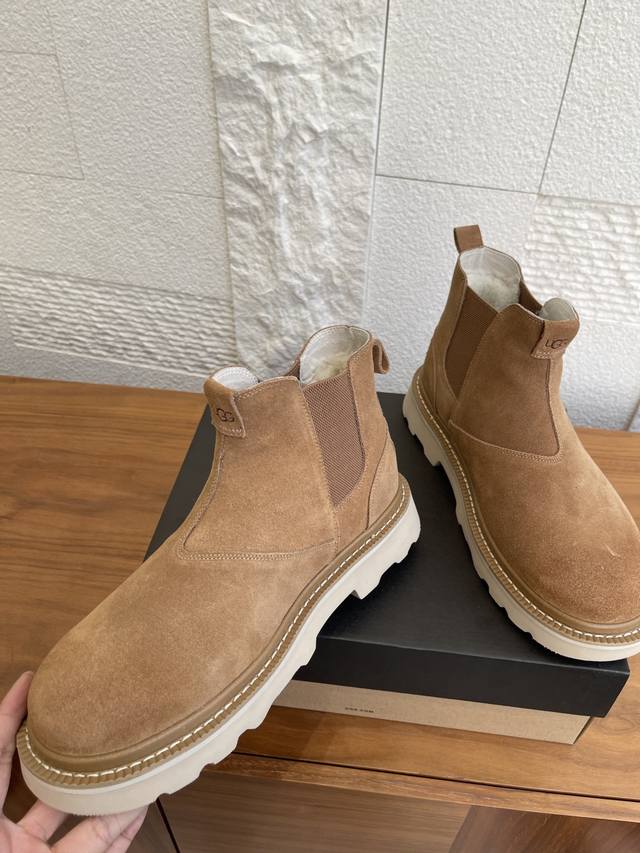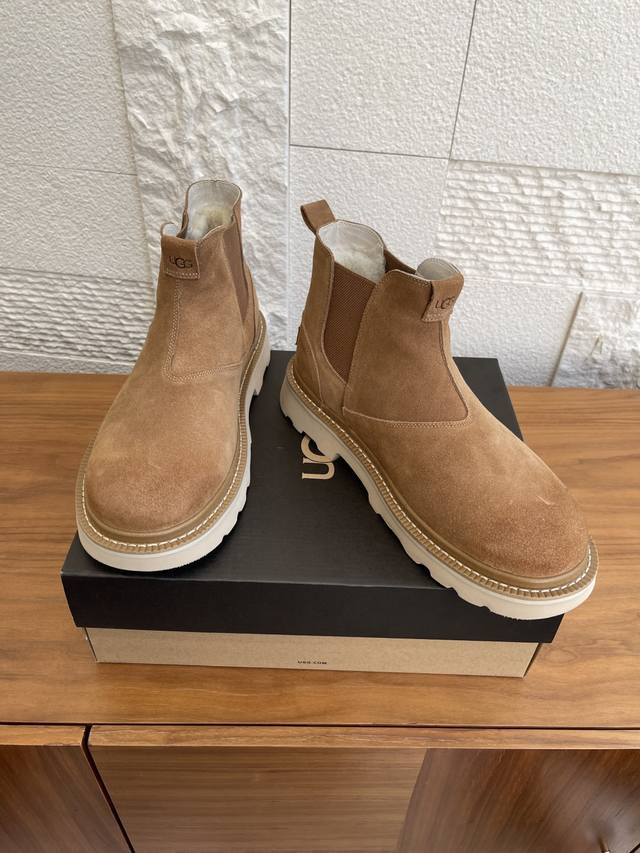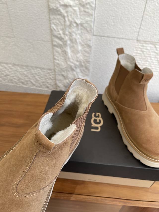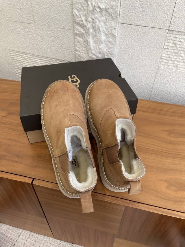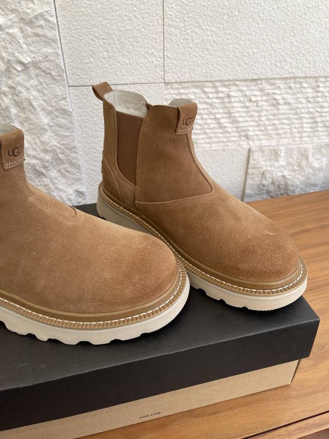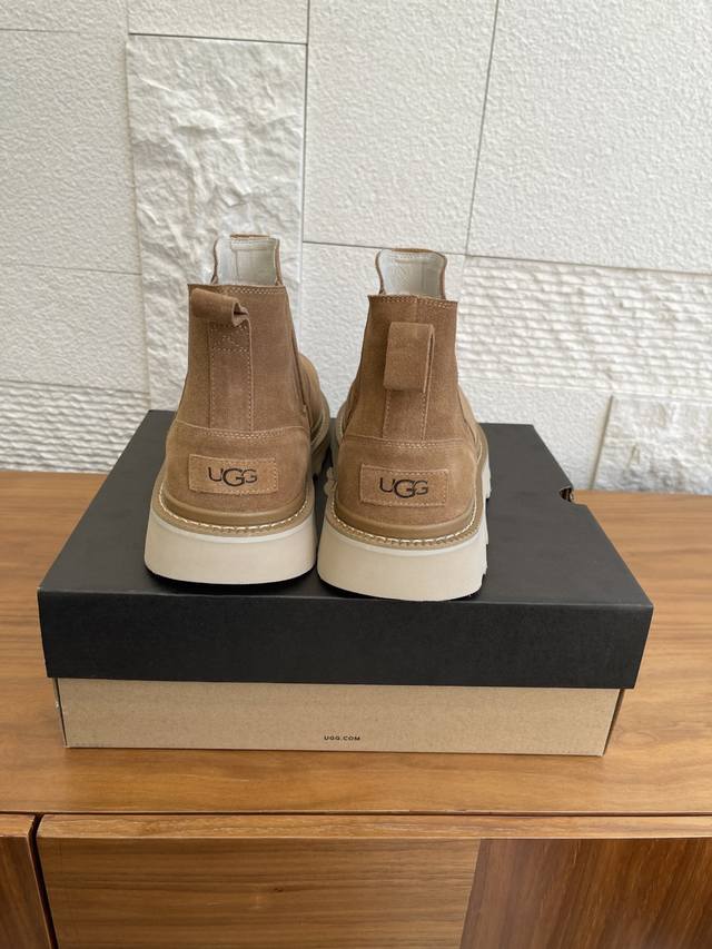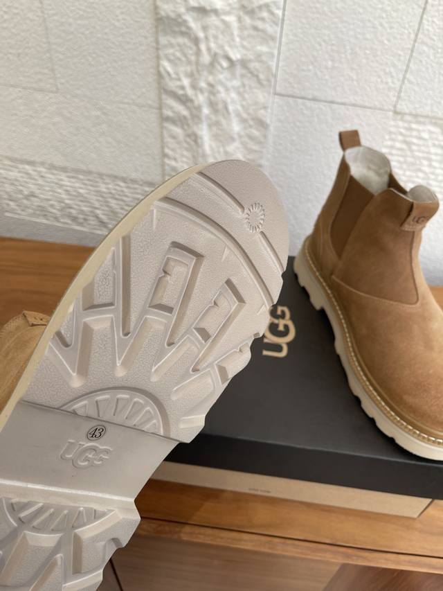 顶级版本: Ugg 2025 秋季新款 男女同款 Hybrid混合款 Chelsea Lug Leather 拉格 切尔西靴 Ugg这款Hybrid混合款Chelsea Lug Leather 拉格切尔西靴利落靴型,撑起秋冬穿搭。牛剖层翻毛皮鞋面+约17毫米Uggplush里衬、鞋垫,功能与保暖兼备。后跟热压花品标徽标,彰显时尚品味。Eva外底防滑蛛网橡胶底,提供良好抓地力。 面料:进口牛反绒 内里:羊皮毛一体 大底:原版Eva发泡大底 Size:女35-40 40定做不退换 男39-45 45定做不退换