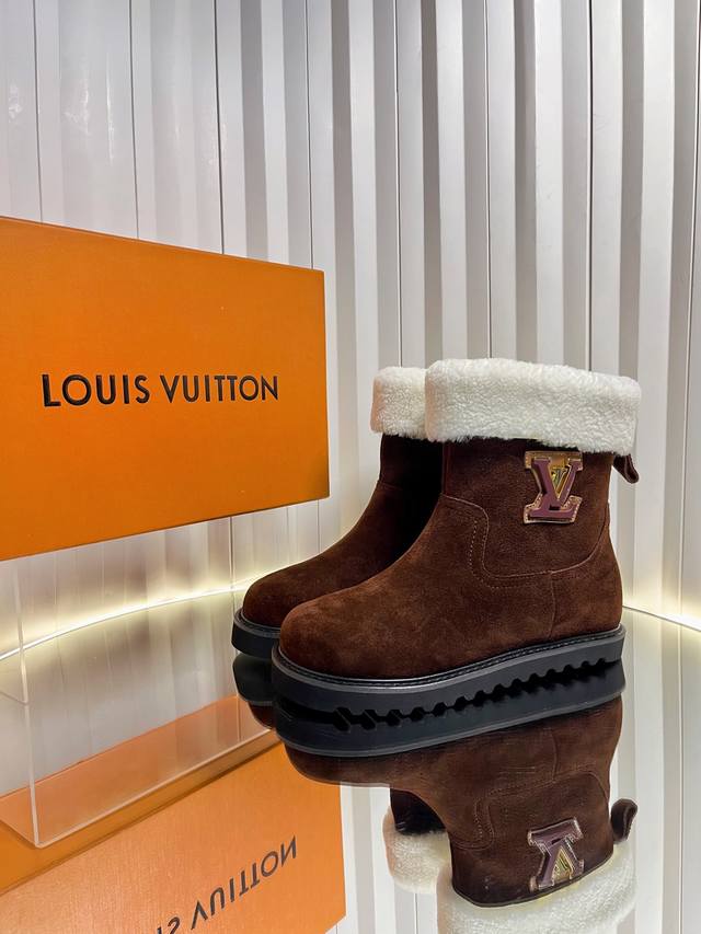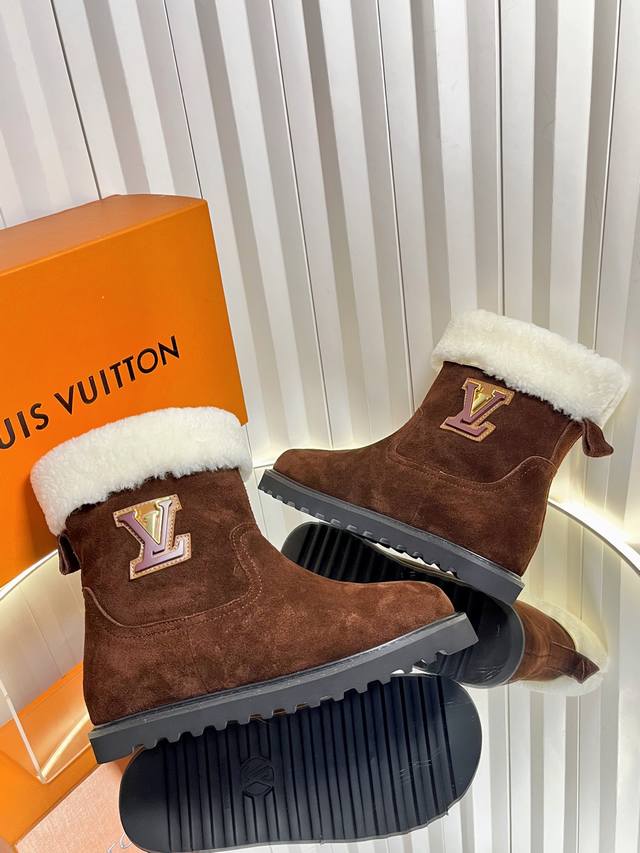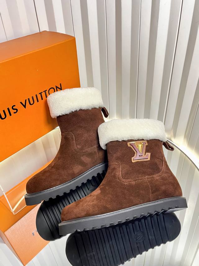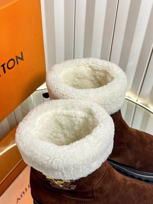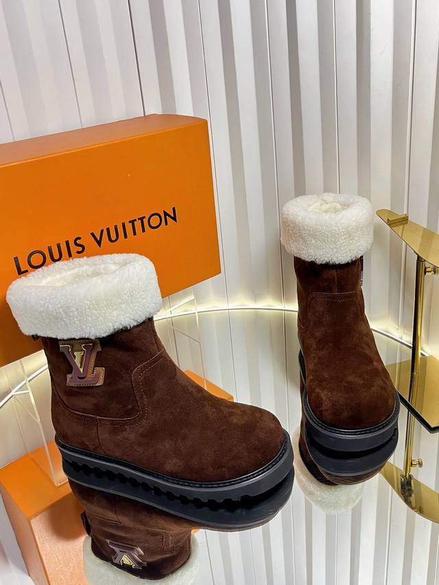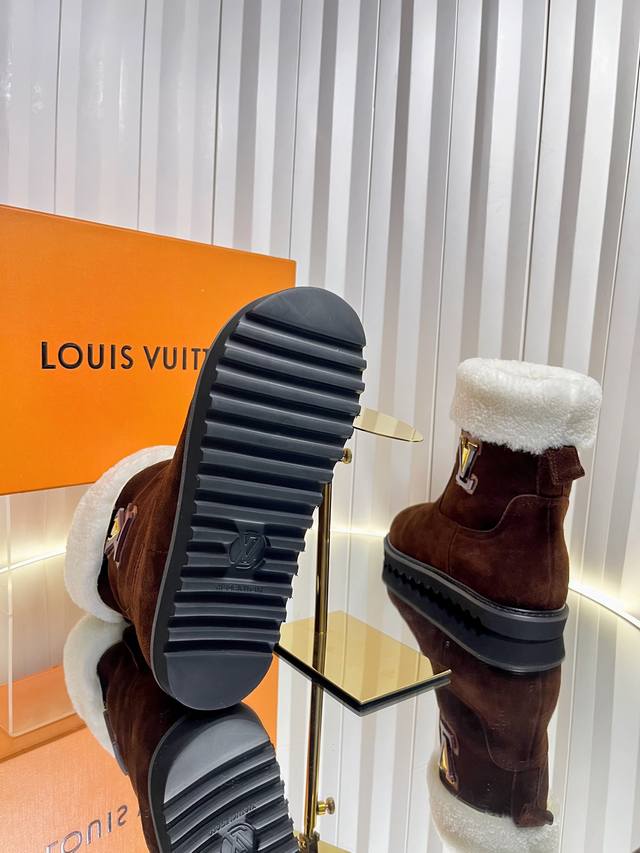 / 顶级版本Lv秋冬新品羊毛短靴,进口皮毛一体羔羊毛,原版五金拼皮大Logo,超美! 鞋面材质是比较厚实的丝光牛反绒 老花,内里羊羔毛,真皮沿条,鞋底原版定制A级胶