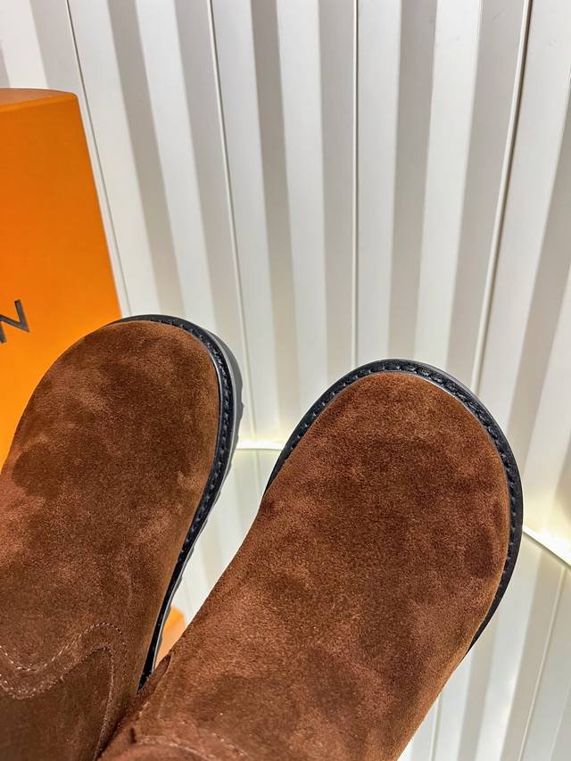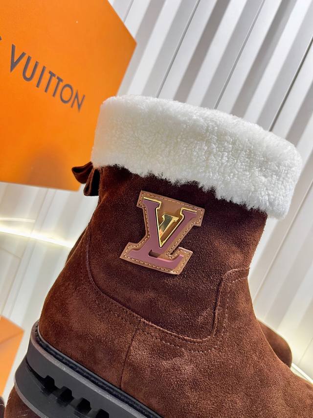 顶级版本Lv秋冬新品羊毛短靴,进口皮毛一体羔羊毛,原版五金拼皮大Logo,超美! 鞋面材质是比较厚实的丝光牛反绒 老花,内里羊羔毛,真皮沿条,鞋底原版定制A级胶