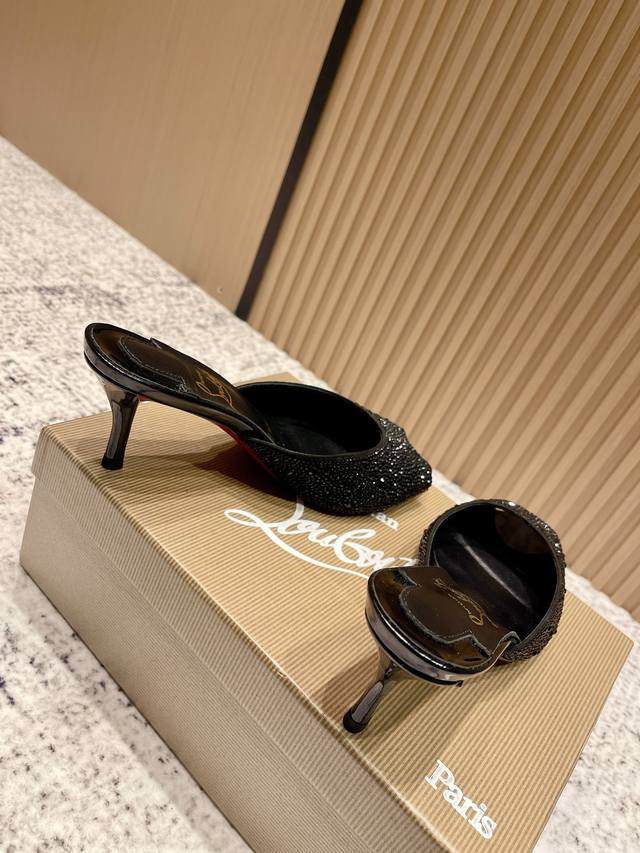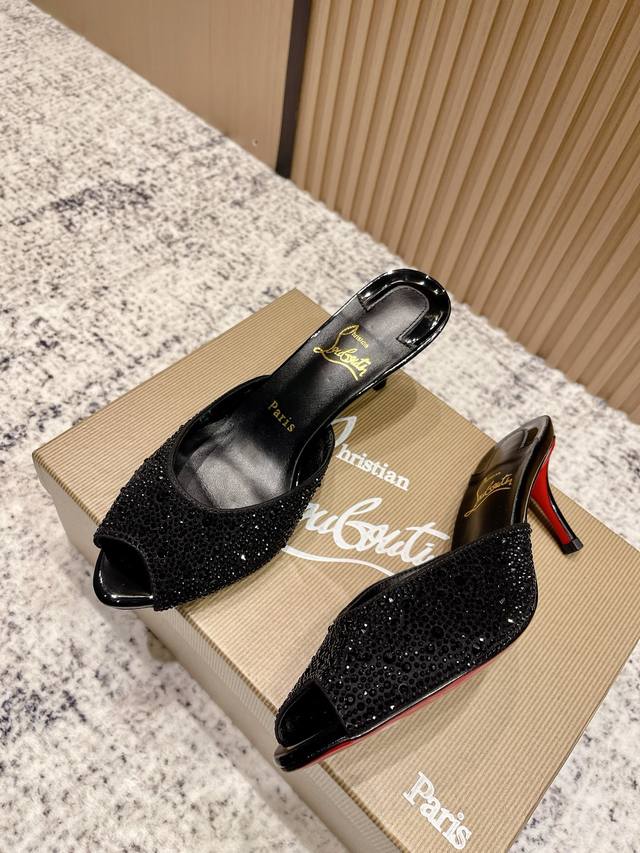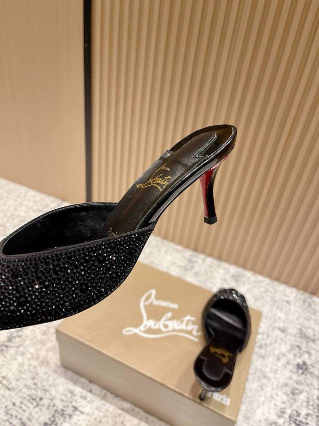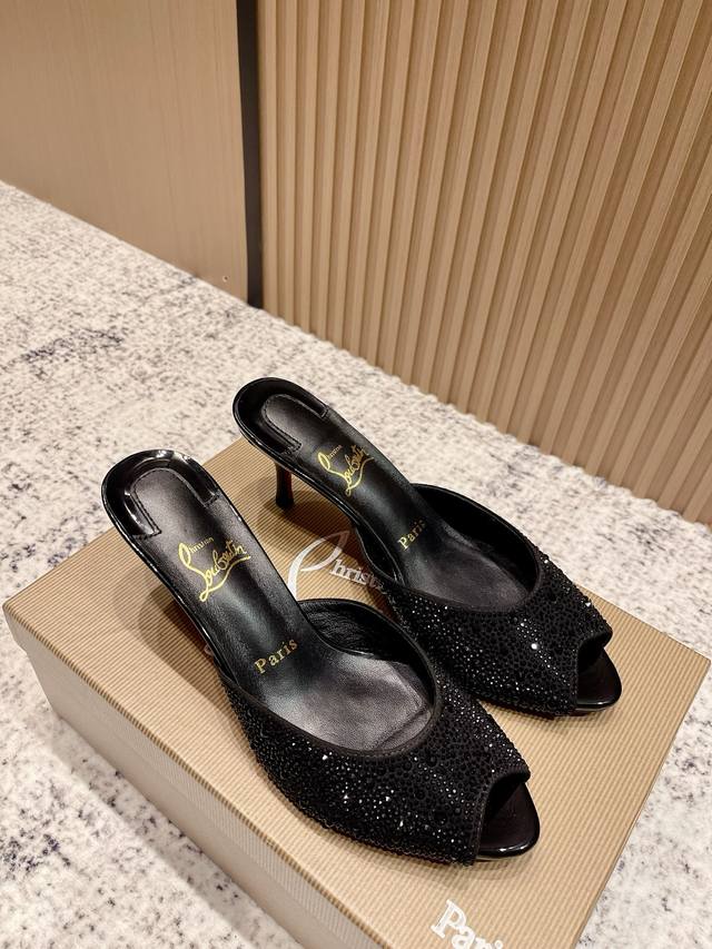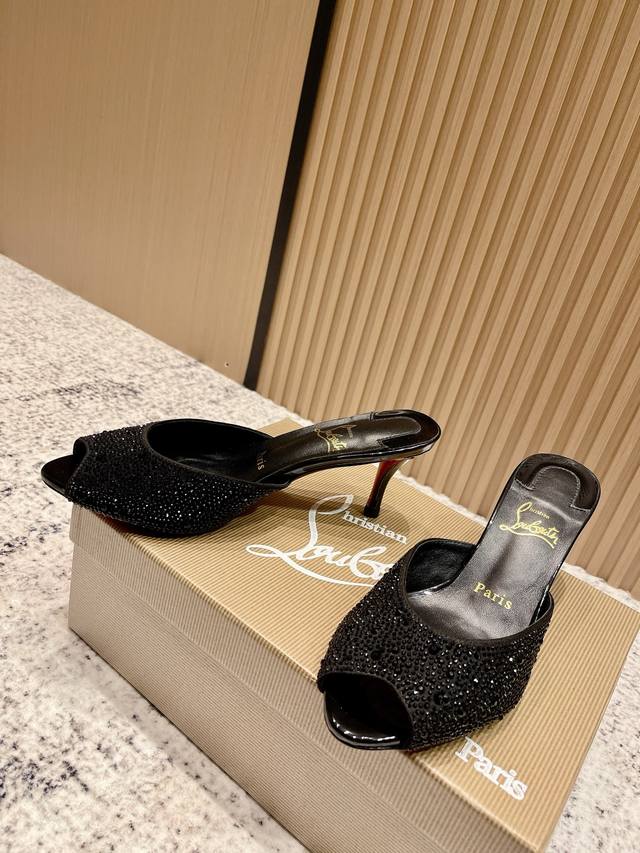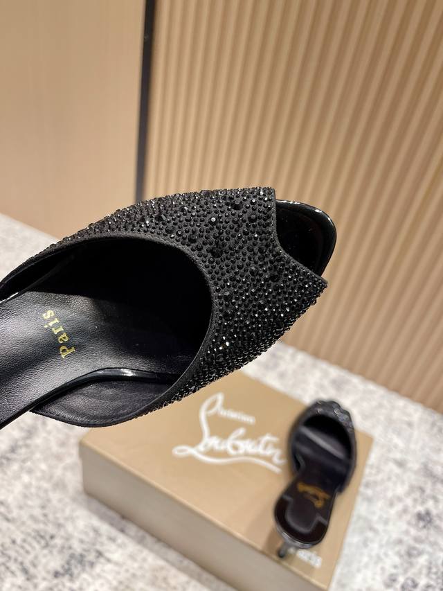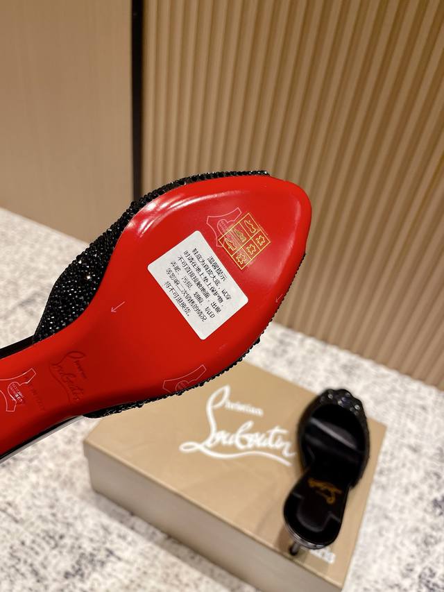 / 顶级版: Christian Louboutin 2025S原版做货重工Cl经典满钻鱼嘴高跟拖鞋~ 鞋面:两千多颗超闪水钻装饰鞋面,鱼嘴露趾的鞋头设计,调皮中带