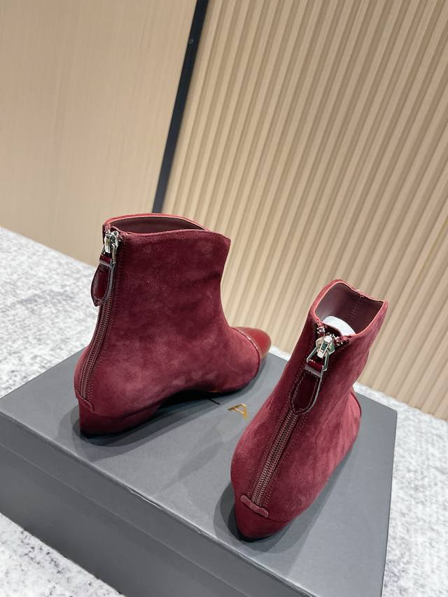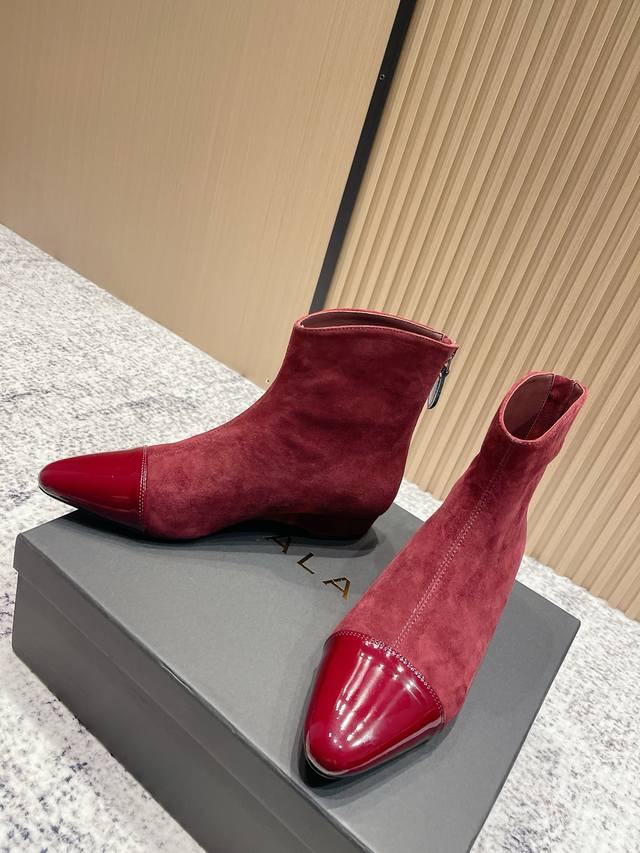 高品质出厂: 小众潮牌Alaia阿莱亚25秋冬新品麂皮后拉链坡跟尖头短靴踝靴! 该款尖头踝靴,拉长腿部线条比例; 羊反绒制成,轻松打造摩登型格。腿长作弊神器 心细高跟物理延长腿部线条黑色系靴筒视觉瘦腿双Buff叠满让腿长多偷5Cm 做魅力圖女人 鞋面:进口细腻羊猄皮 牛漆皮 内里垫脚:羊皮 鞋底:意大利进口真皮大底 码数:35-42 40.41.42定不退换