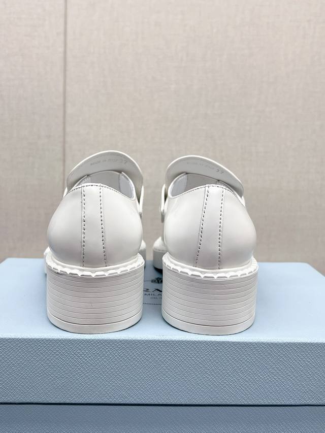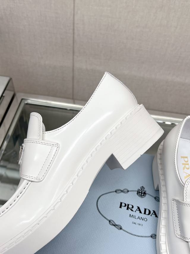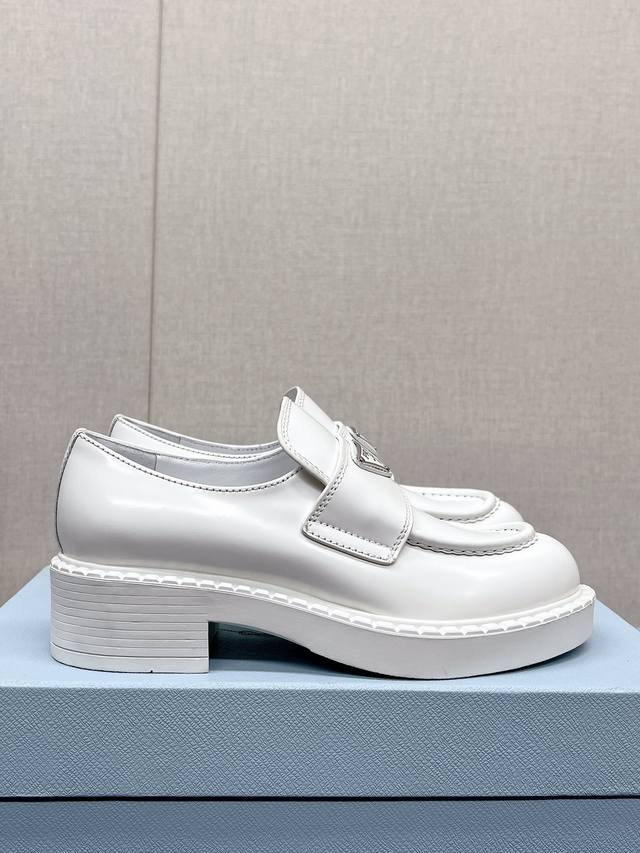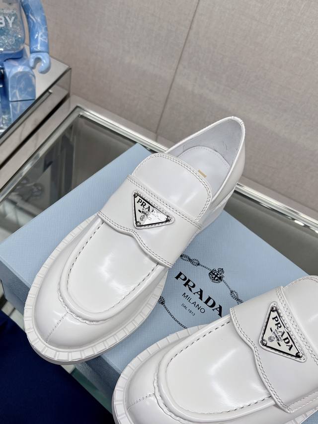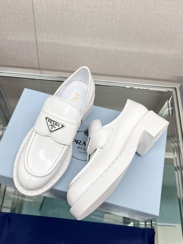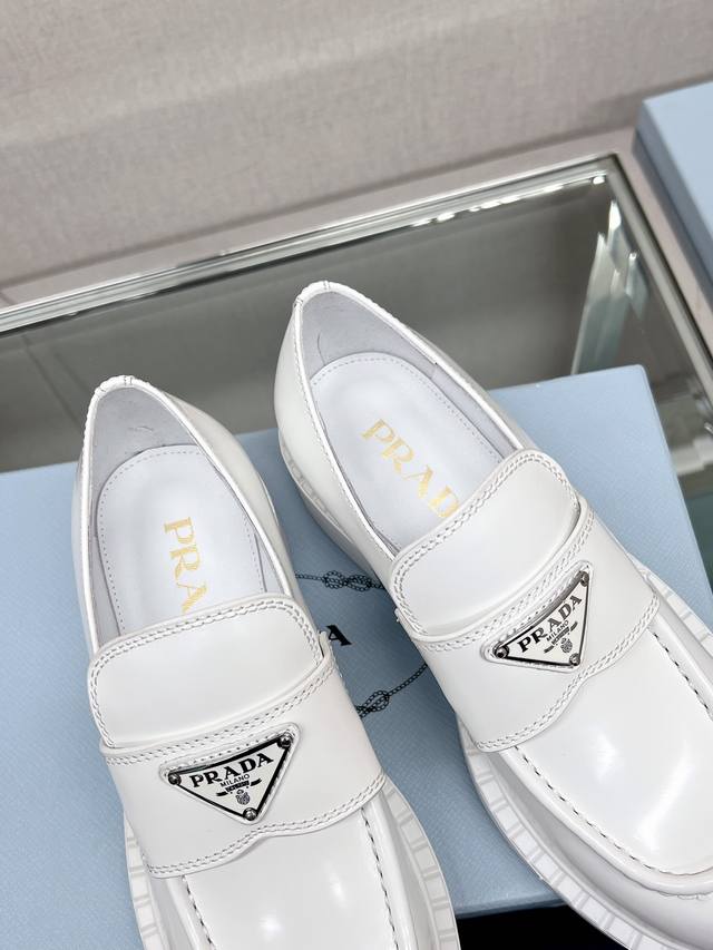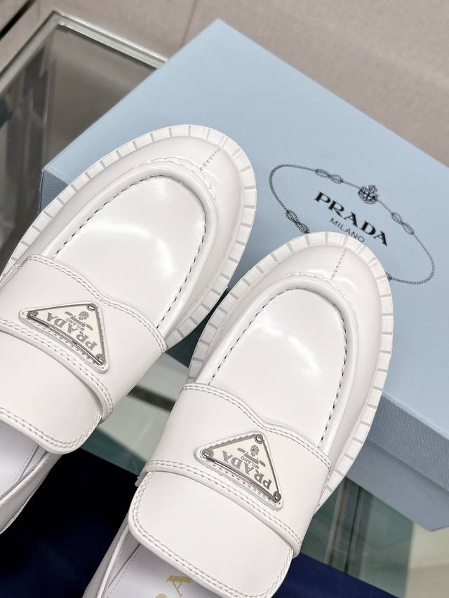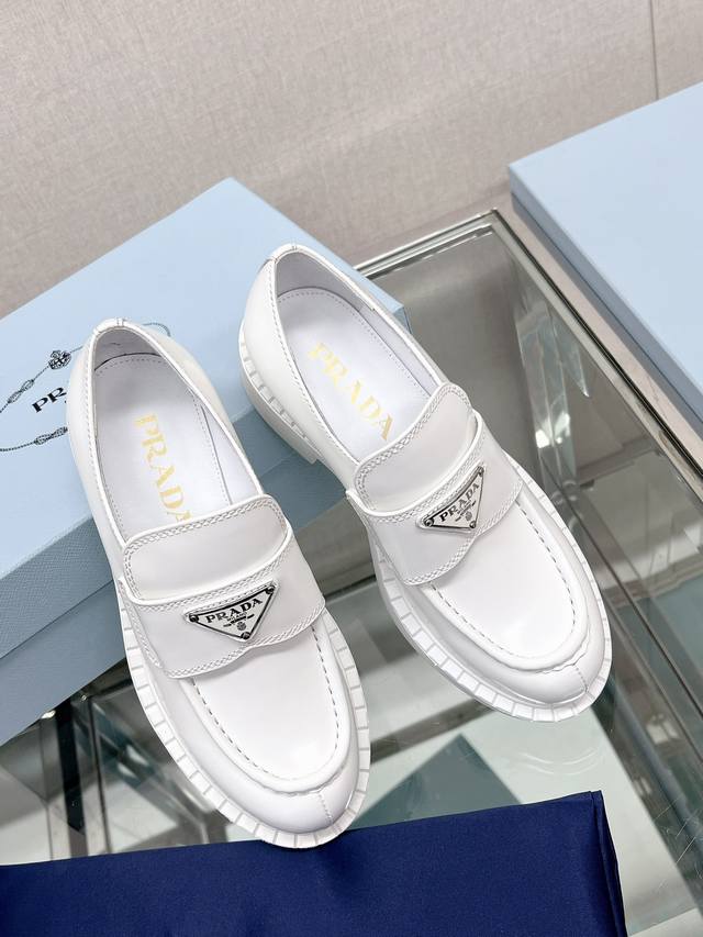 / 高版本 Prad*明星同款三角标扣乐福鞋 这款鞋履配有鲜明的圆形鞋头,橡胶厚底为经典乐福鞋注入现代外观,涂珐琅三角形金属徽标装饰彰显品牌格调。惯用于精美鞋履的复