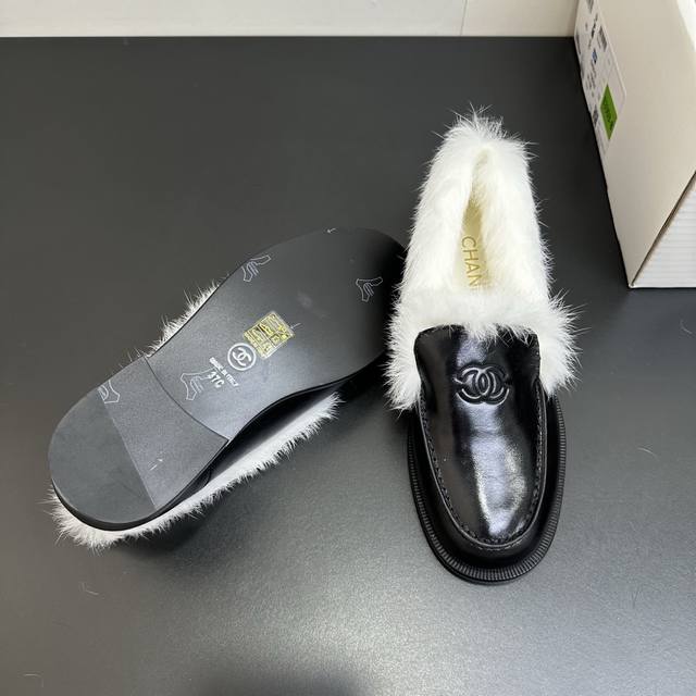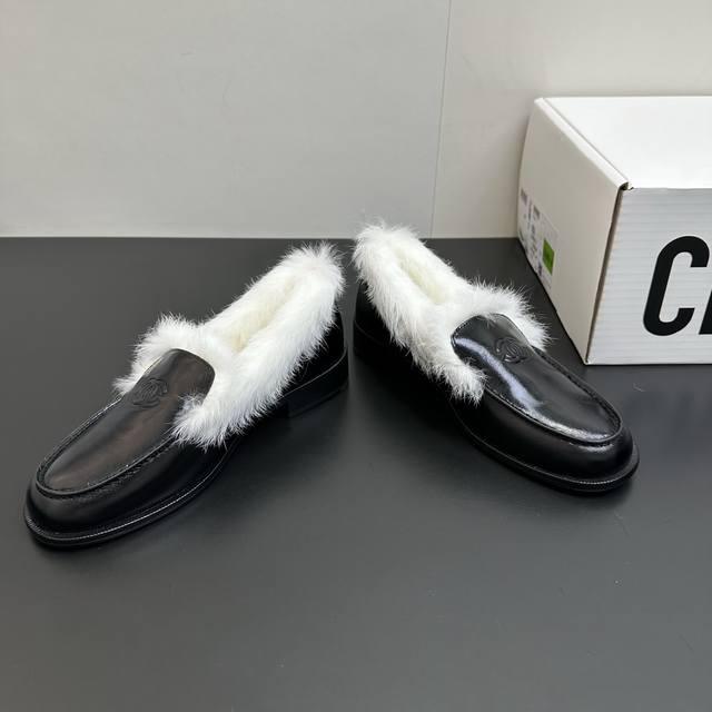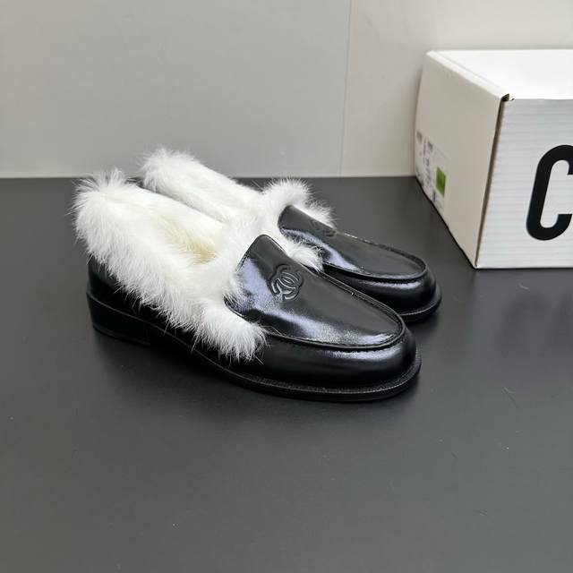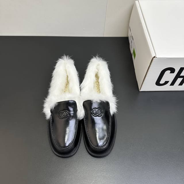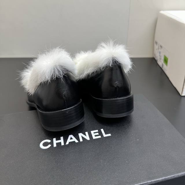 2025秋冬Chanel香奈儿兔毛乐福鞋。精选优质皮革与柔软兔毛绒,经典双C标识彰显品牌格调。黑、白、棕多色可选,一脚蹬设计适配多种穿搭风格,无论是职场通勤还是