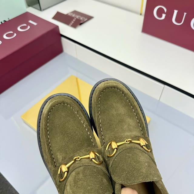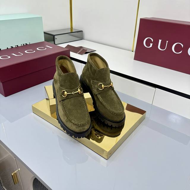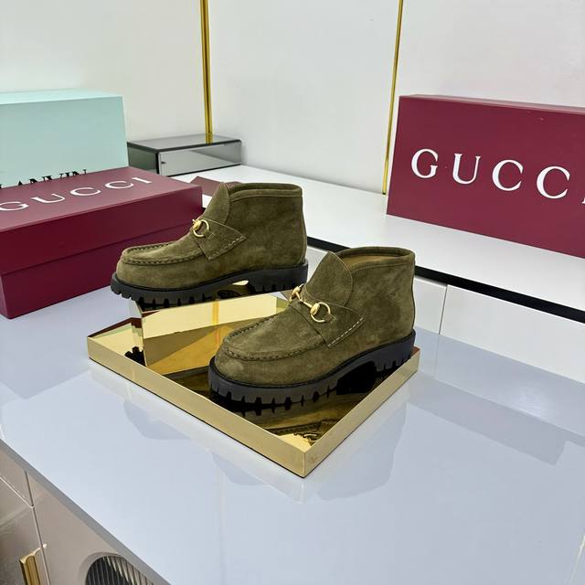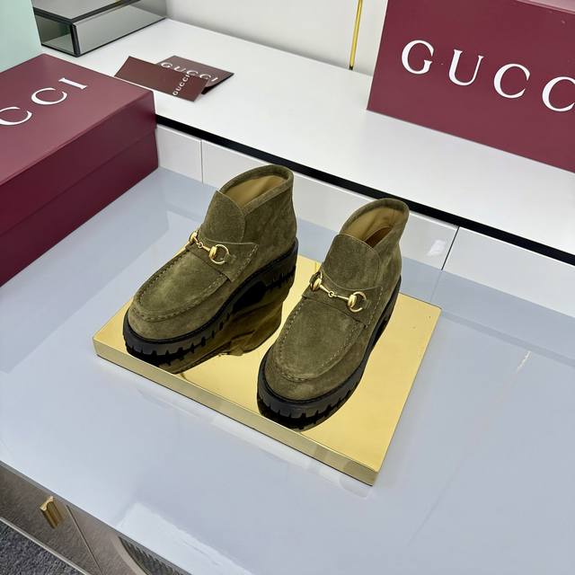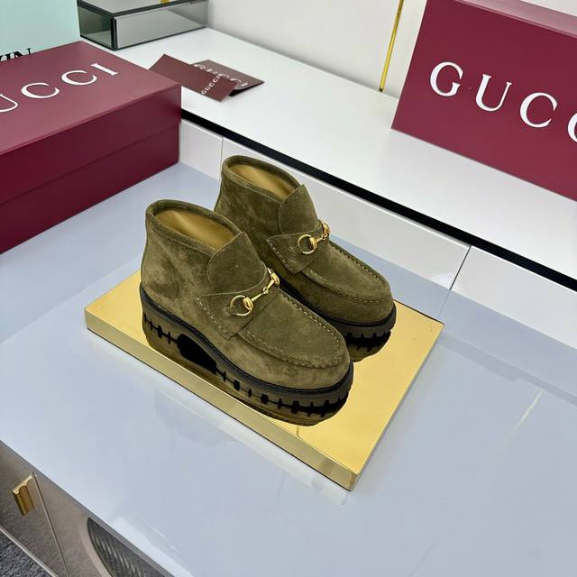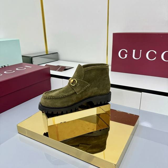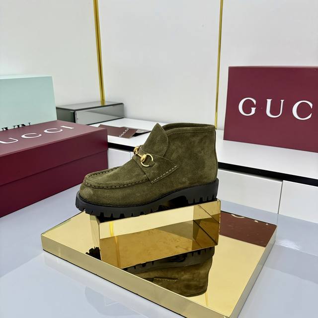 2025-Gucci这款马衔扣踝靴采用经典乐福鞋版型,将典藏设计与现代精髓合而为一。这款靴子采用特有的瘦窄版型,以咖啡色绒面材质匠心打造,意在致敬品牌设计传承。 深绿色绒面材质 女士 浅金色调配件 马衔扣 橡胶鞋底 平底35-41 跟高:1.5厘米