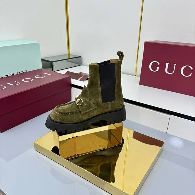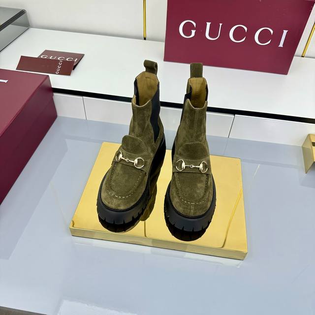 / 2025-Gucci这款马衔扣踝靴采用经典短靴版型,将典藏设计与现代精髓合而为一。这款靴子采用特有的瘦窄版型,以咖啡色绒面材质匠心打造,意在致敬品牌设计传承。